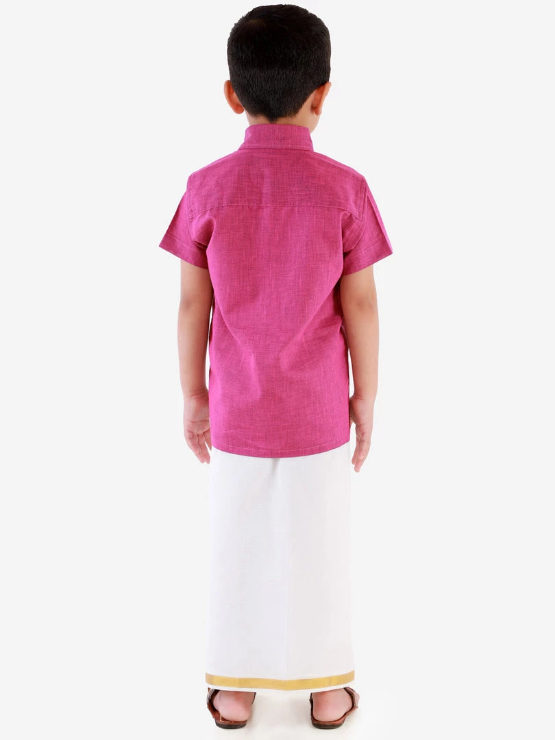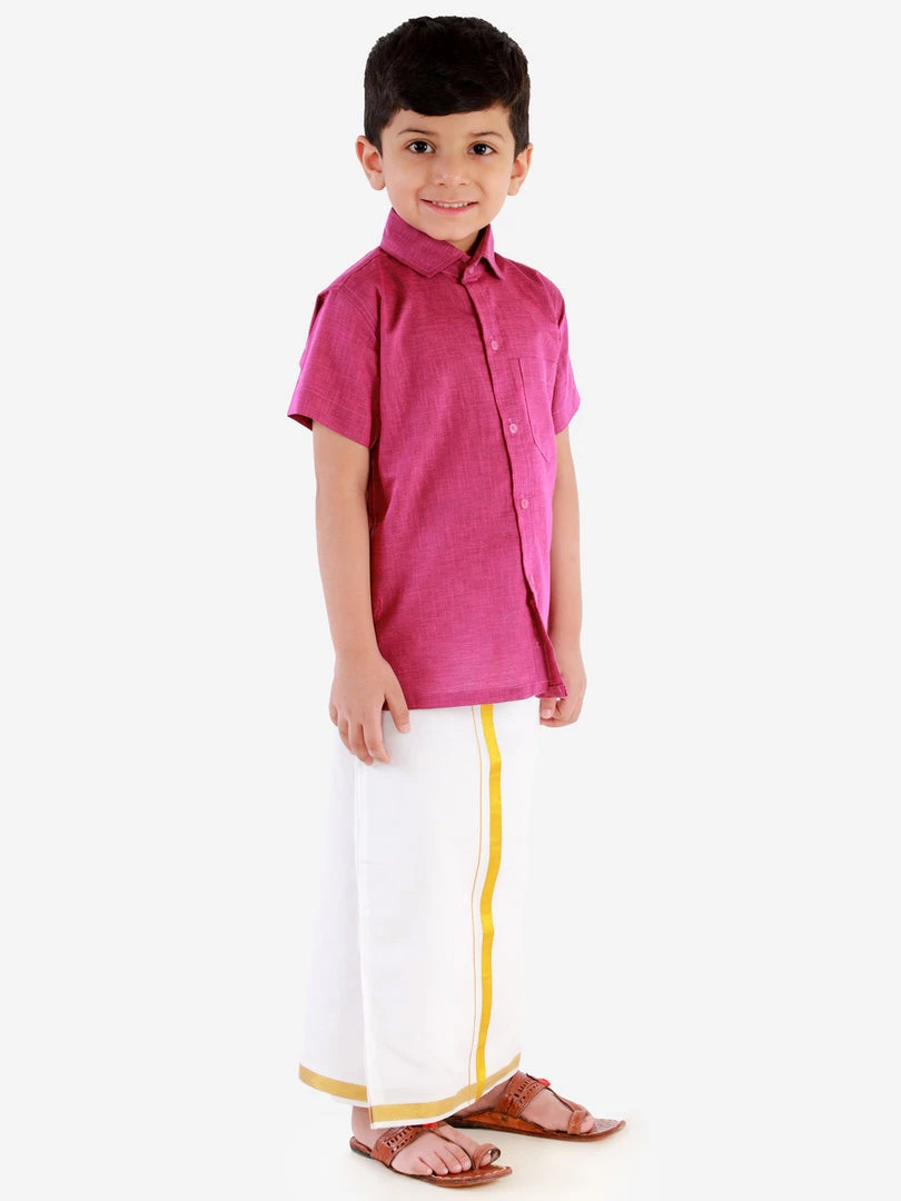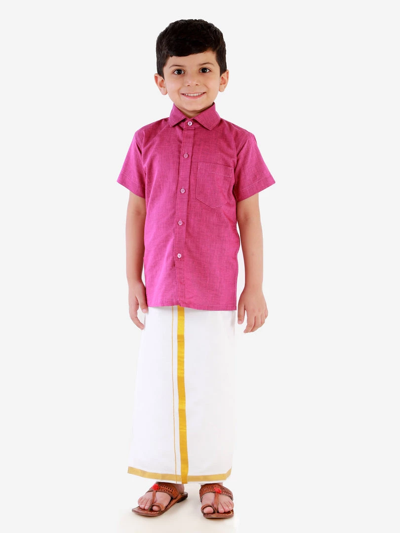 This clothing set consists of shirt, mundu vesty style dhoti pants and dupatta Purple textured ethnic casual shirt, has a shirt collar, short sleeves, full button placket, straight hem, and one patch pocket. A white solid dupatta with woven golden border