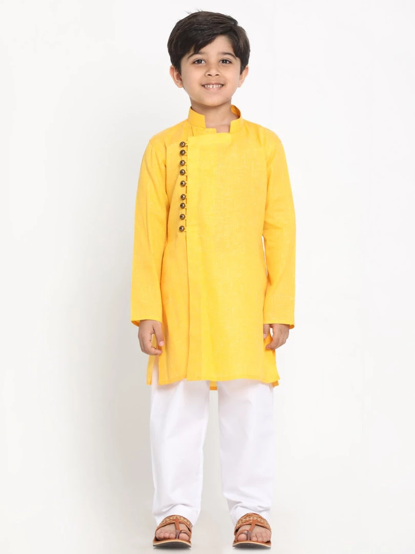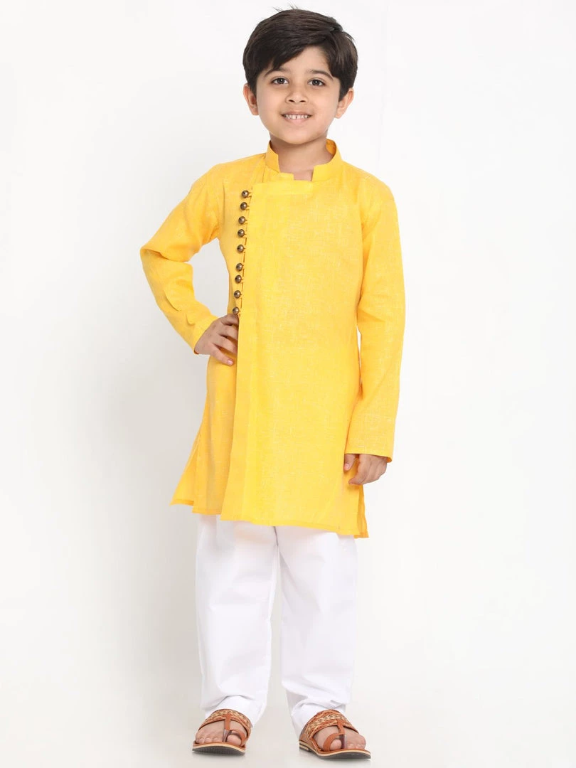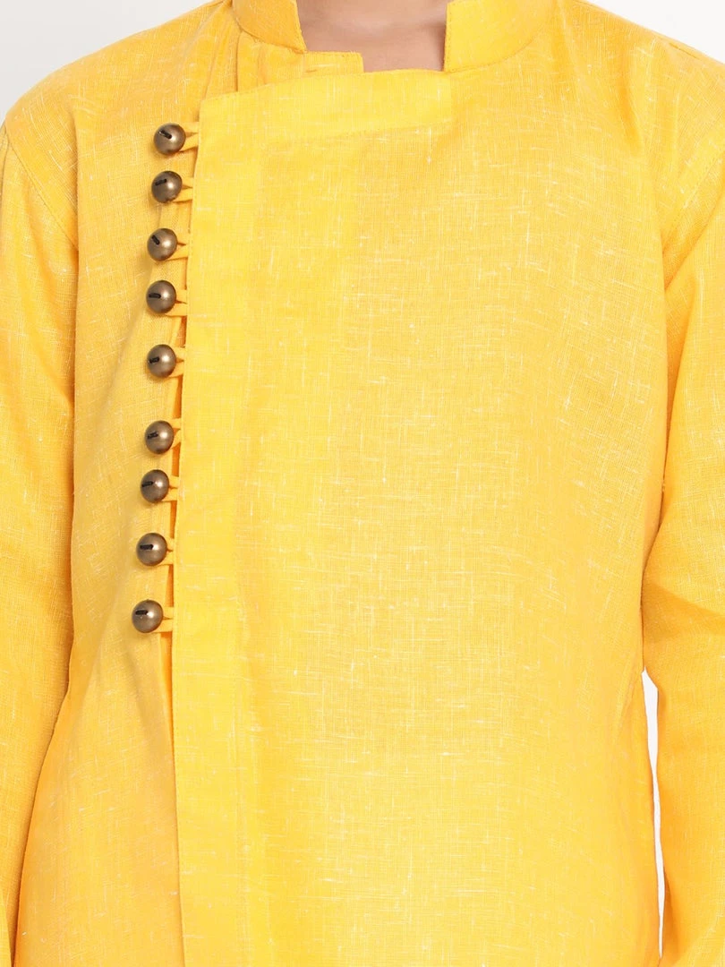 Yellow straight knee length textured angrakha style kurta, has a mandarin collar, long sleeves, asymmetric hem, side button with loop, side slits