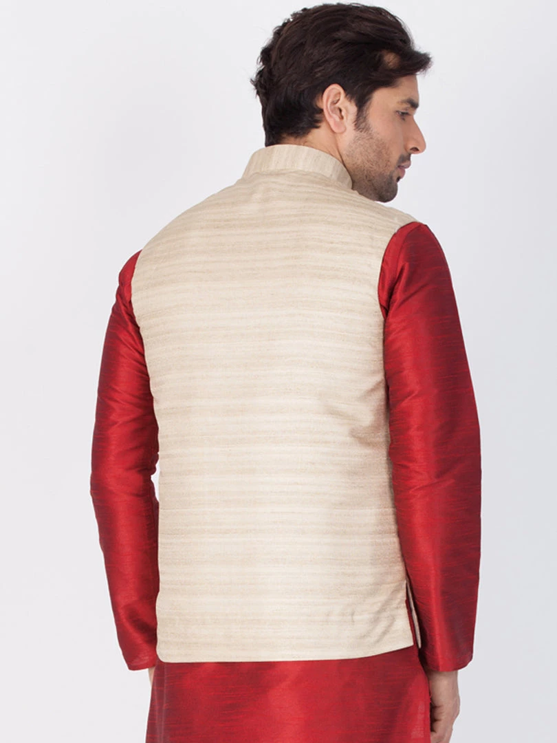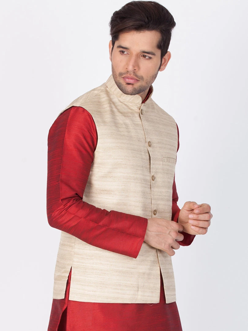 Beige woven-design slim-fit Nehru jacket, has a mandarin collar, sleeveless, a full button placket, three pockets