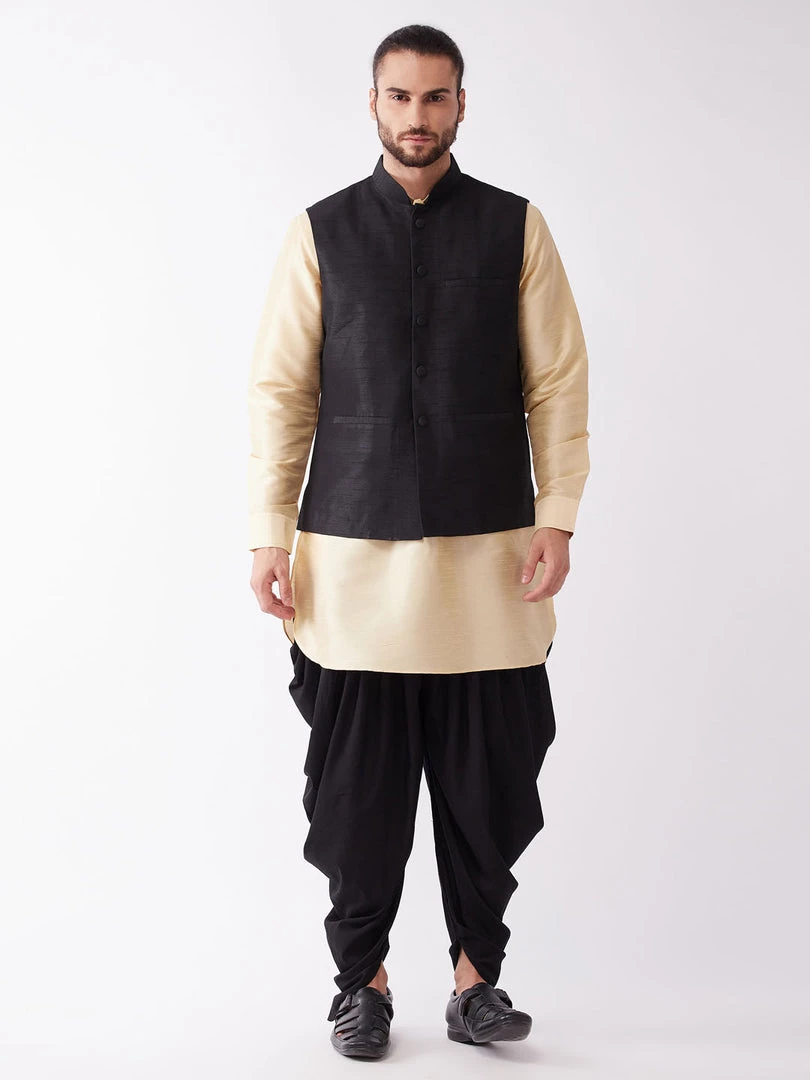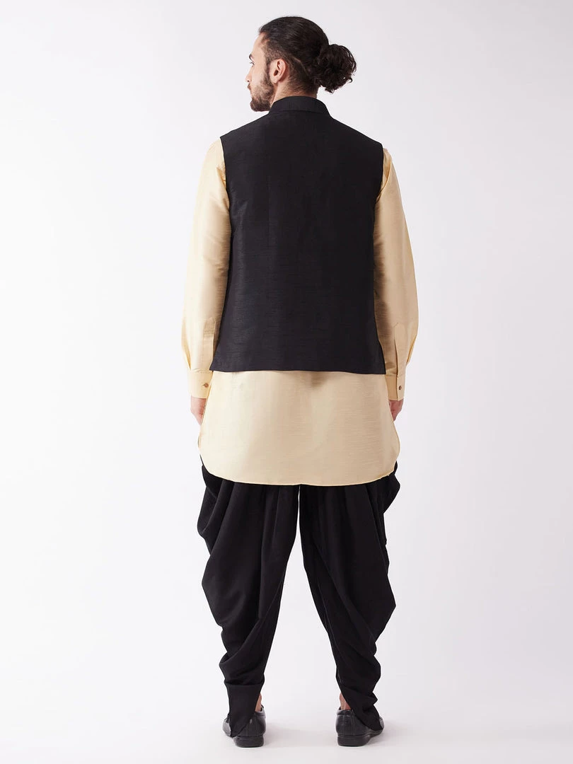 Gold Solid kurta with dhoti pants and Black colored solid Nehru jacket