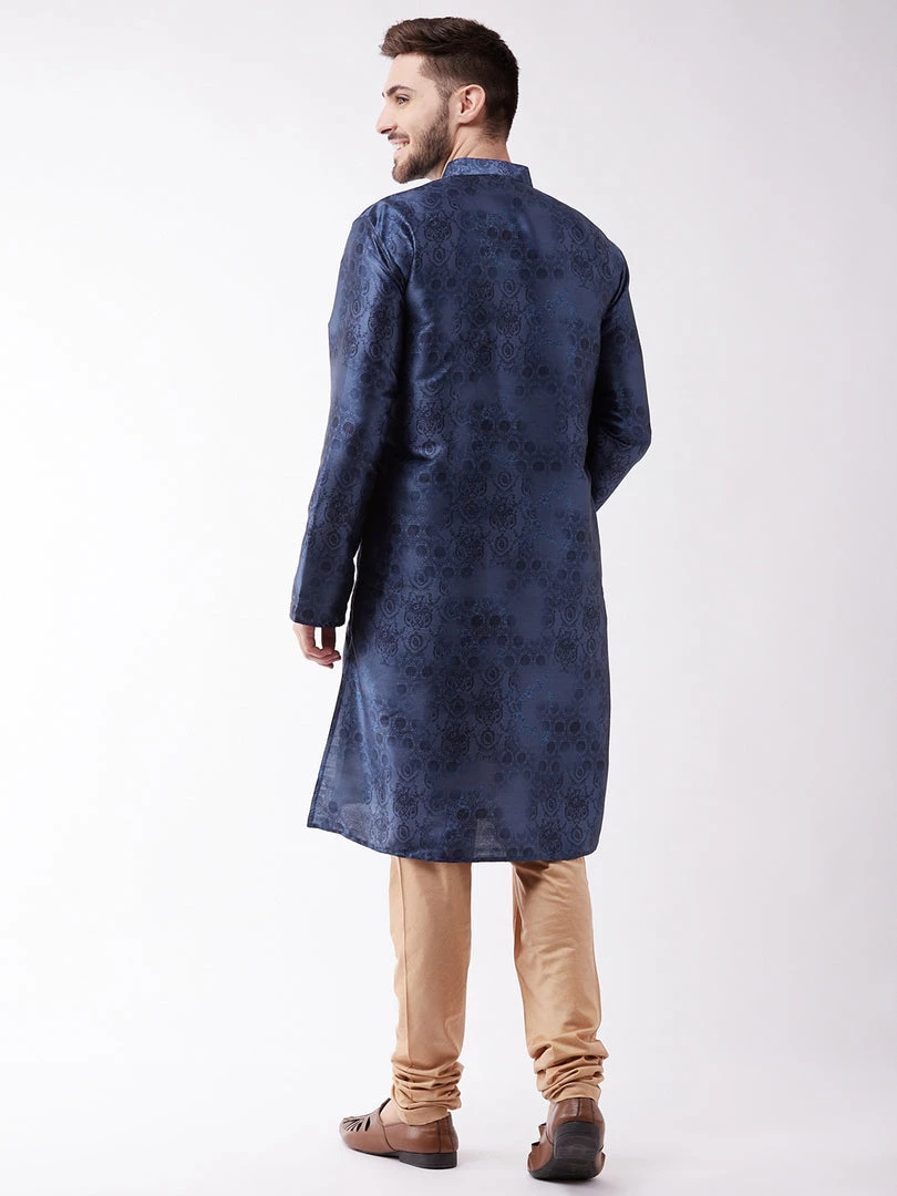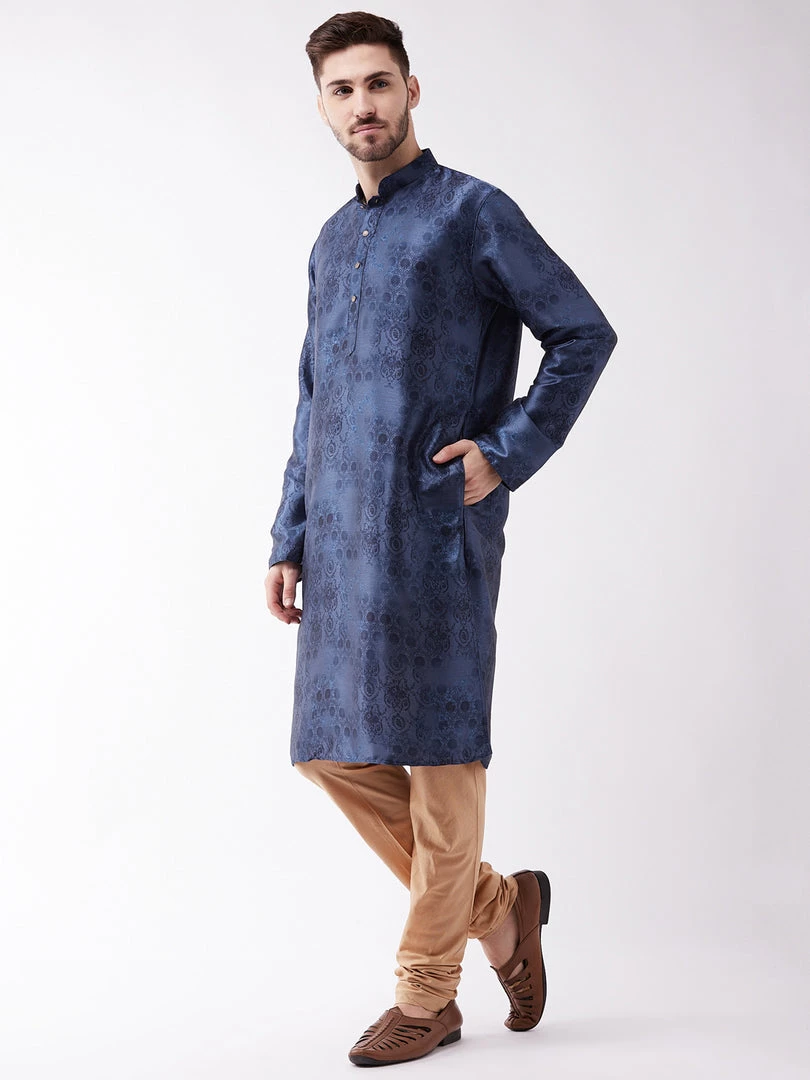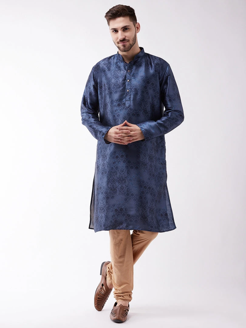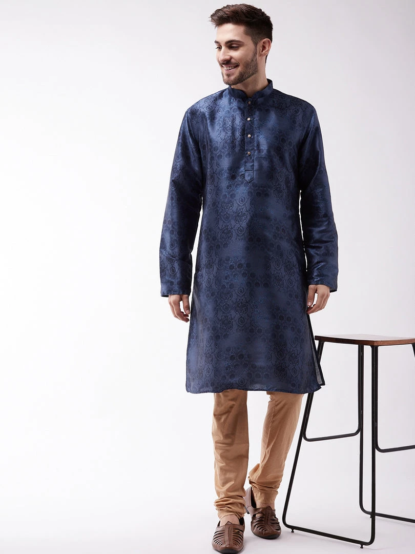 Blue jacquard straight knee-length kurta, has a mandarin collar, button placket, long sleeves, a straight hem, and side slits. Comes with a rose gold solid churidar, has a drawstring closure.