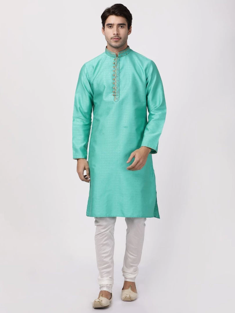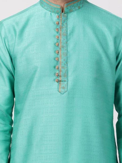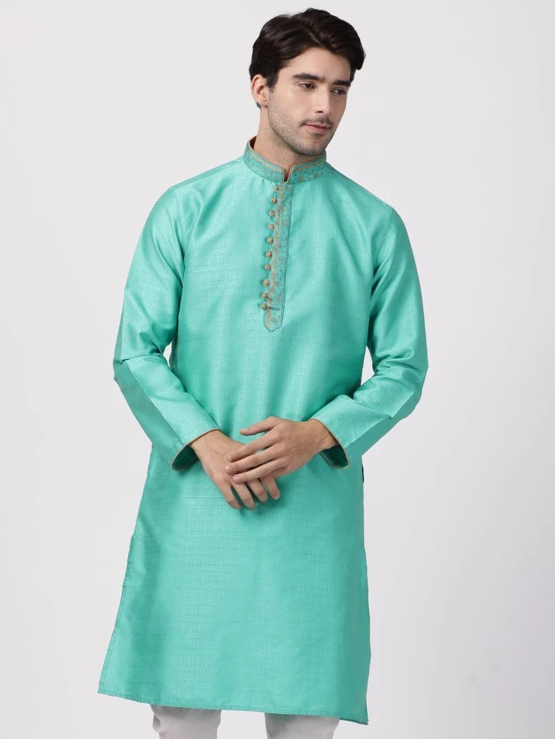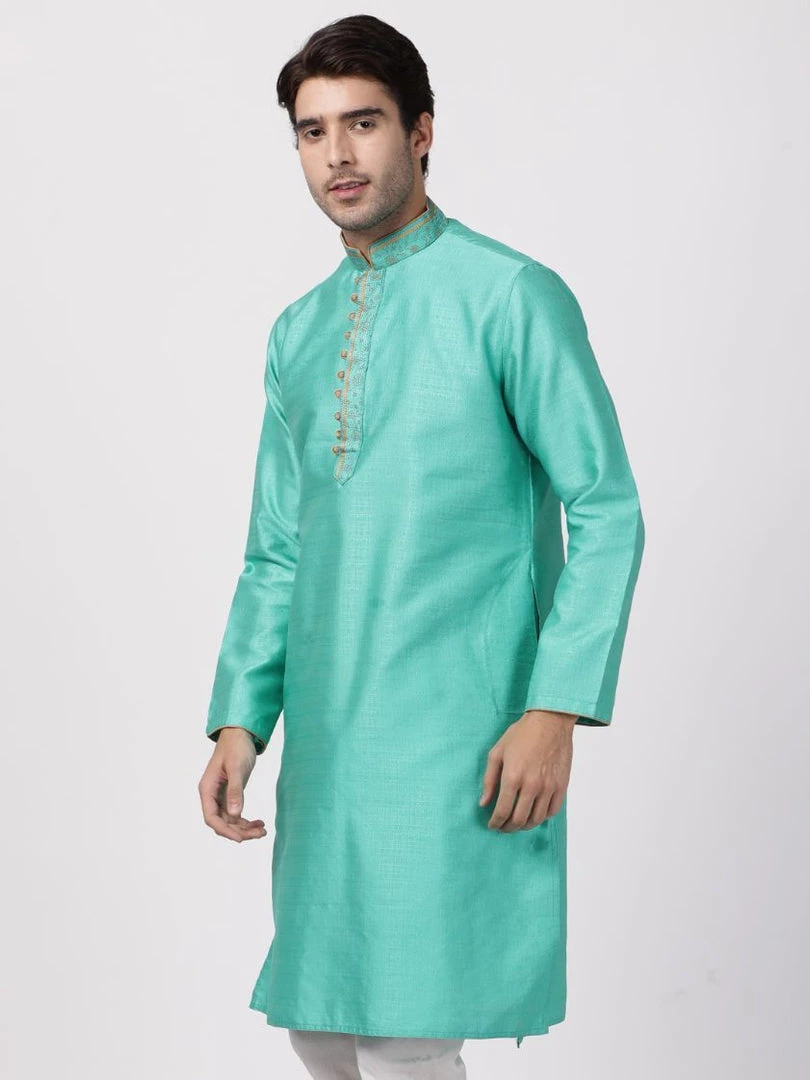 Green solid straight kurta, has a mandarin collar, long sleeves, button placket, straight hem, and side slits. Embroidered design on collar.