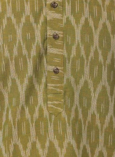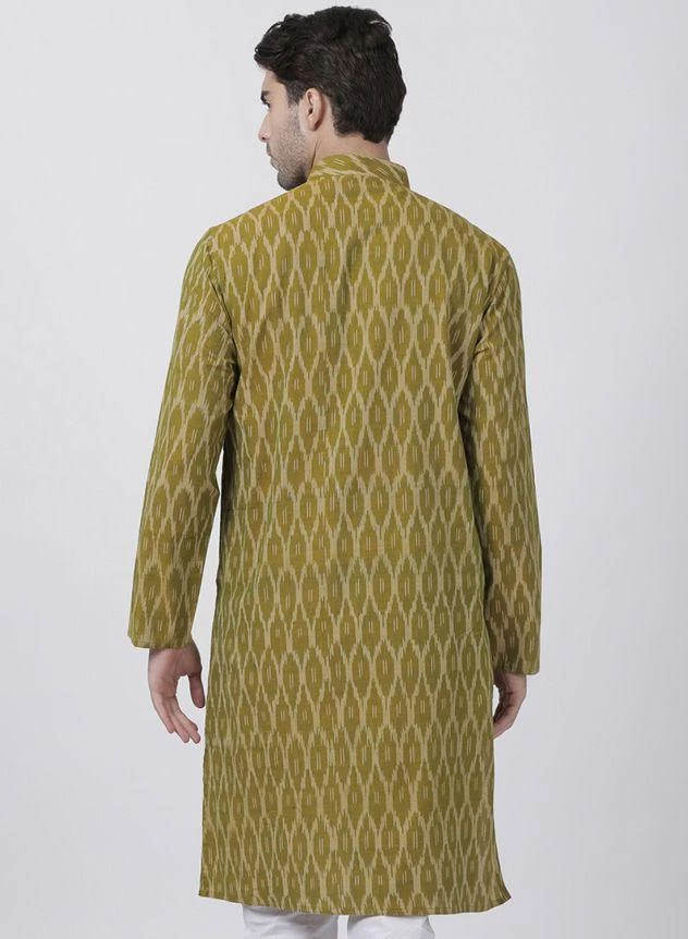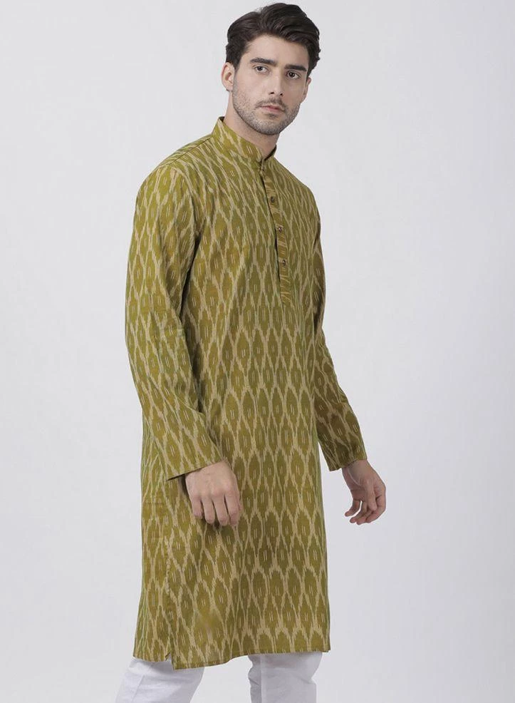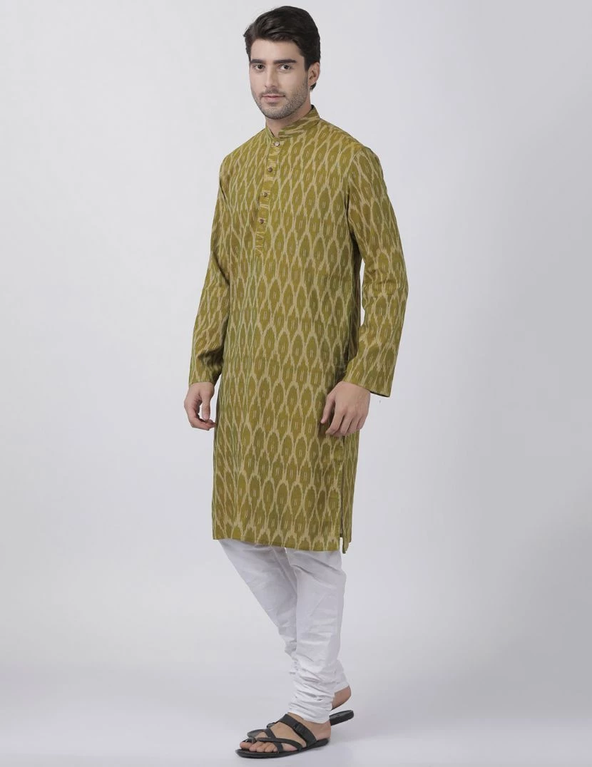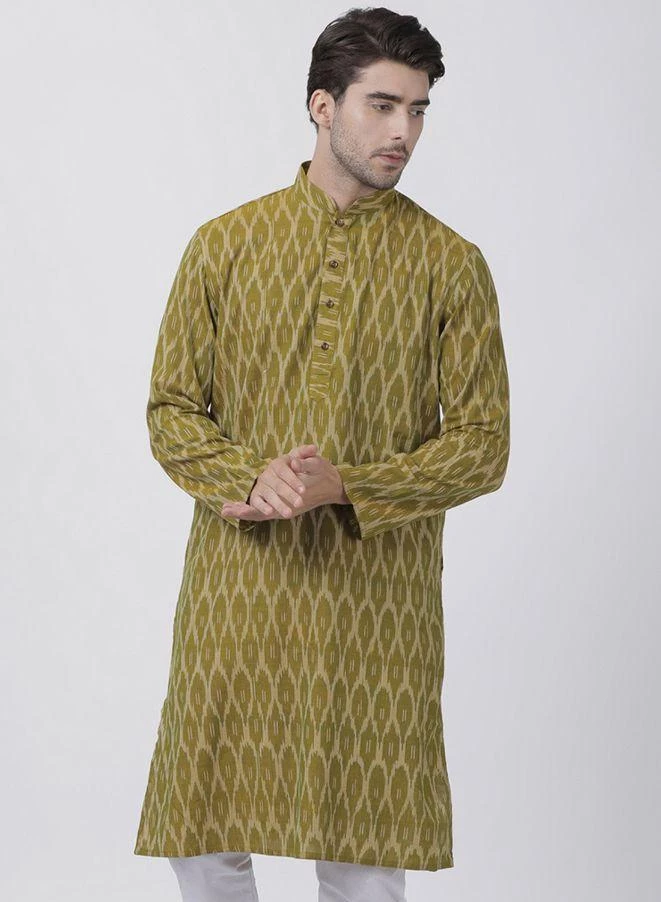 Olive Green Woven Kurta, Long Sleeve, Straight hem, has a Mandarin Collar, Straight Knee-length, Side slits.