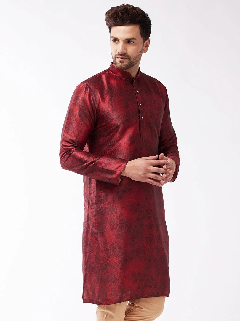 Maroon jacquard straight knee-length kurta, has a mandarin collar, button placket, long sleeves, a straight hem, and side slits.