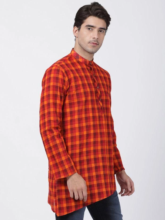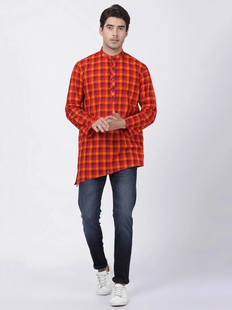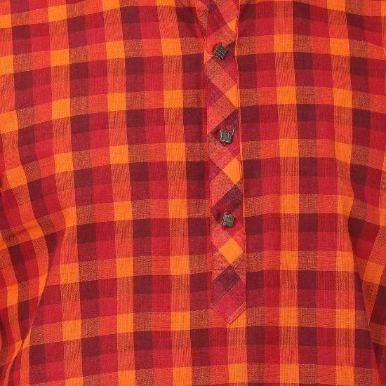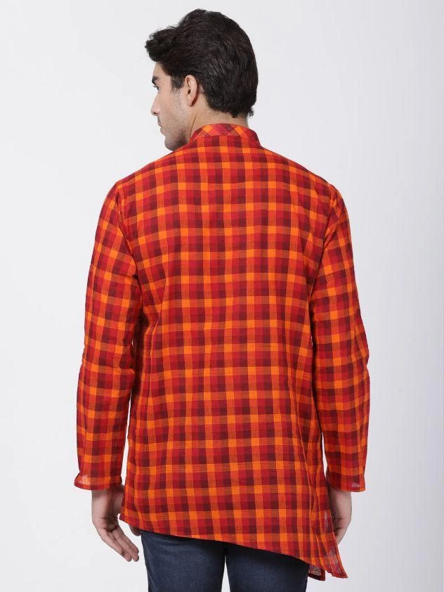 Red and orange checked straight short woven kurta, has a mandarin collar, long sleeves, asymmetric hem, side slits