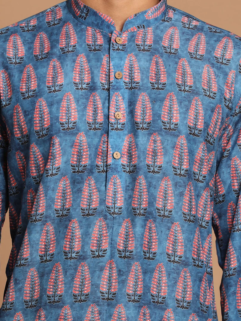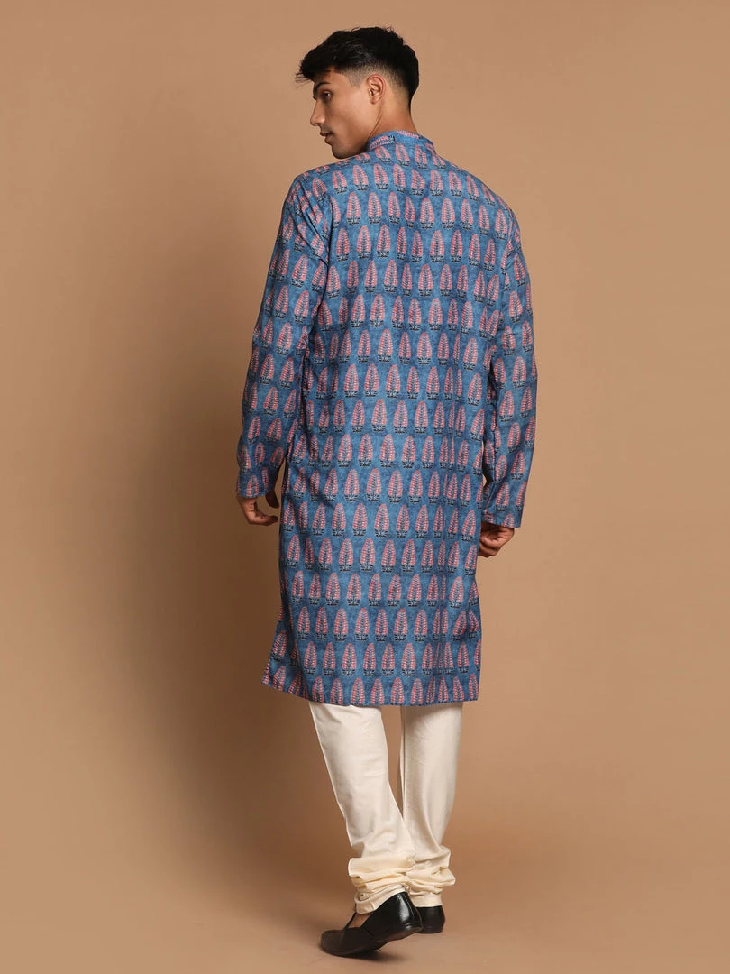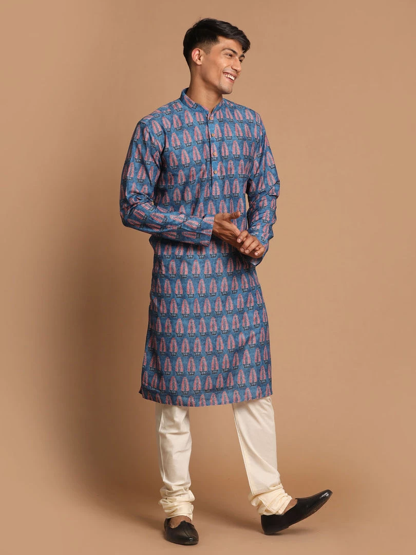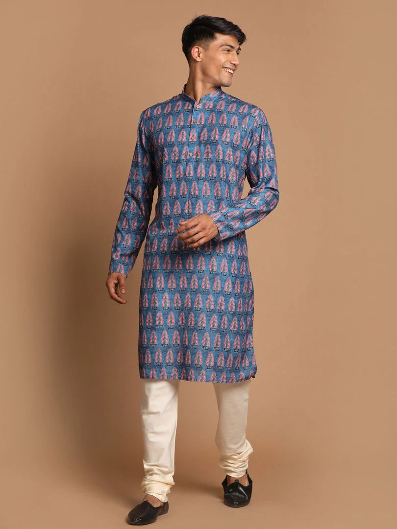 Blue color silk blend printed, straight, knee length kurta, has a mandarin collar, button placket, long sleeves, straight hem, and side slits. Comes with a cream solid churidar, has a drawstring closure.