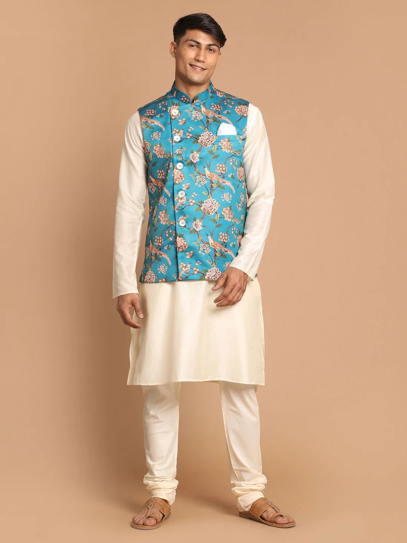 Cream Solid kurta with solid Pyjama and Turquoise Nehru jacket.