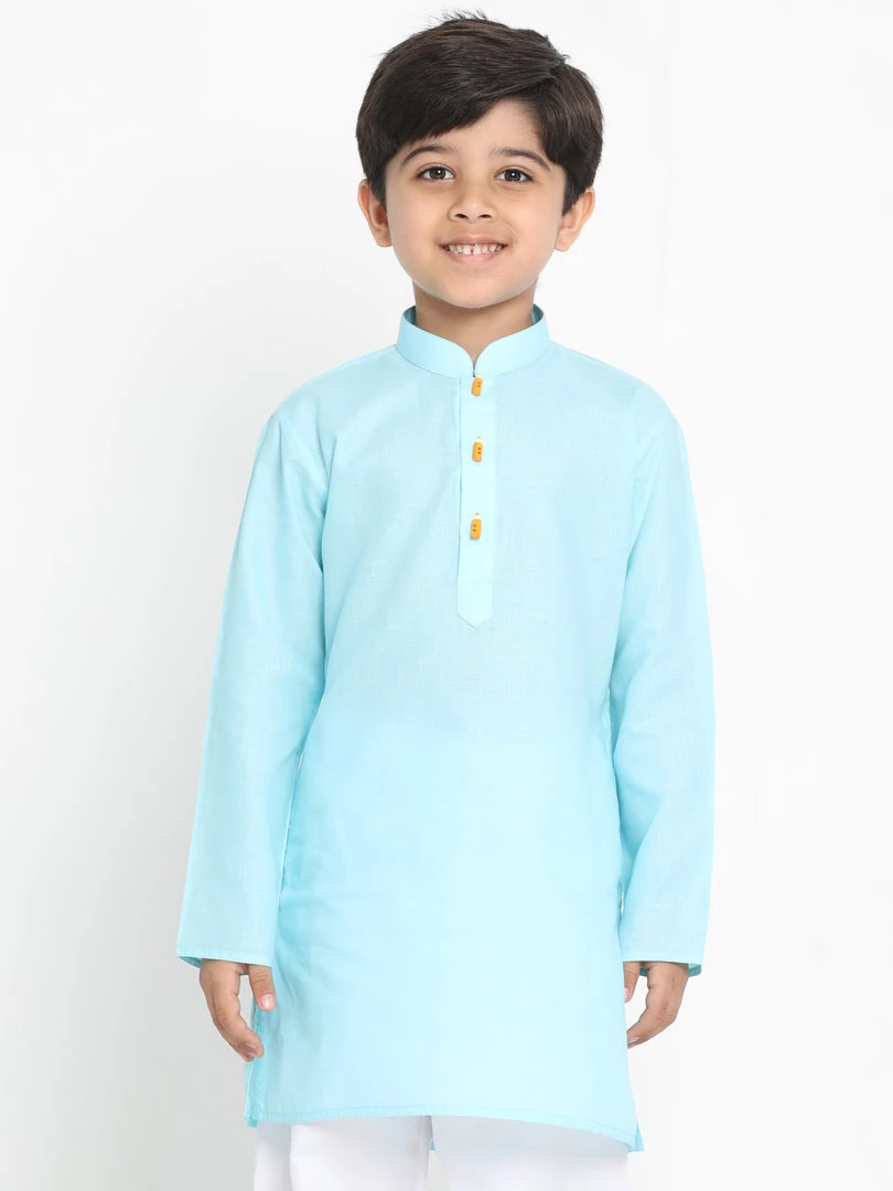 Aqua Blue solid straight knee length kurta, has mandarin collar, long sleeves, button placket with wooden pencil shape button, straight hem and side slits,