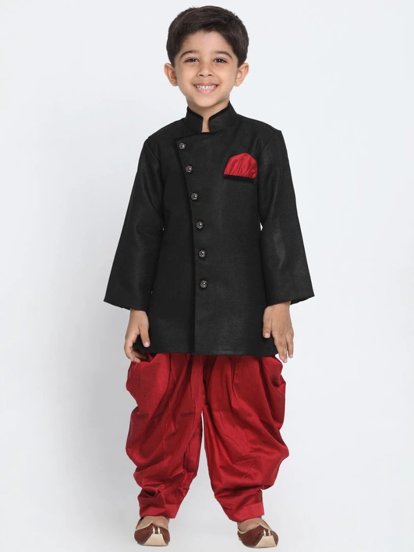 This sherwani set from Vastramay is a must have in your little boys ethnic collection wardrobe. Team is with a pair of mojaris for a cute ethnic look.