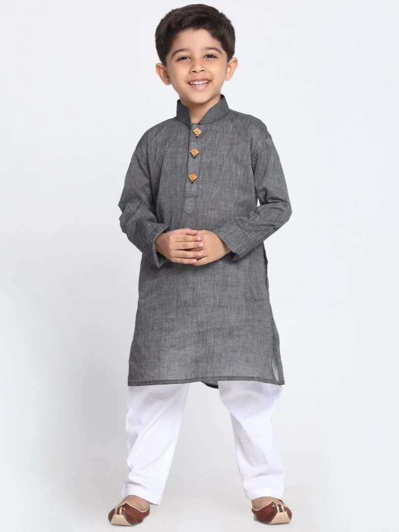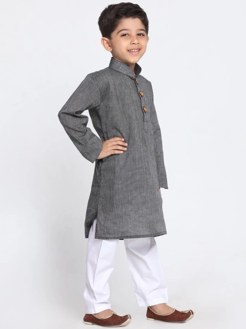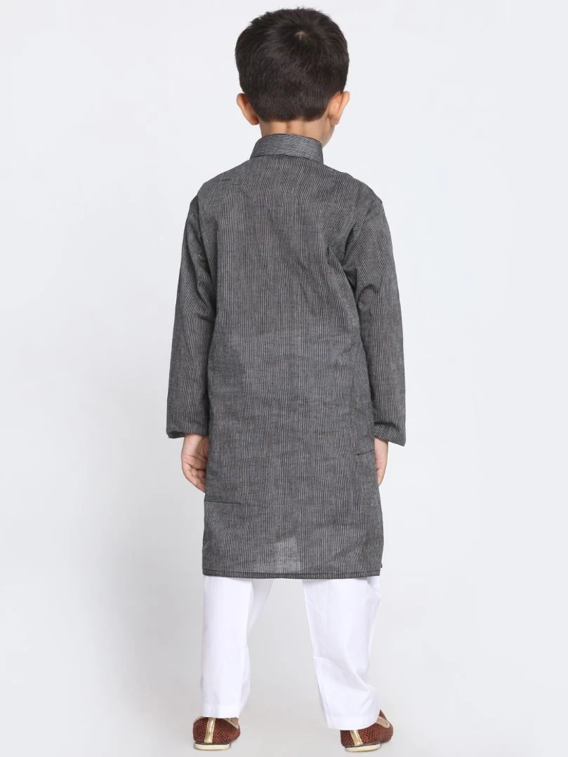 Black straight woven stripe knee length kurta, has a mandarin collar, long sleeves, straight hem, placket with kite shape wooden button, side slits