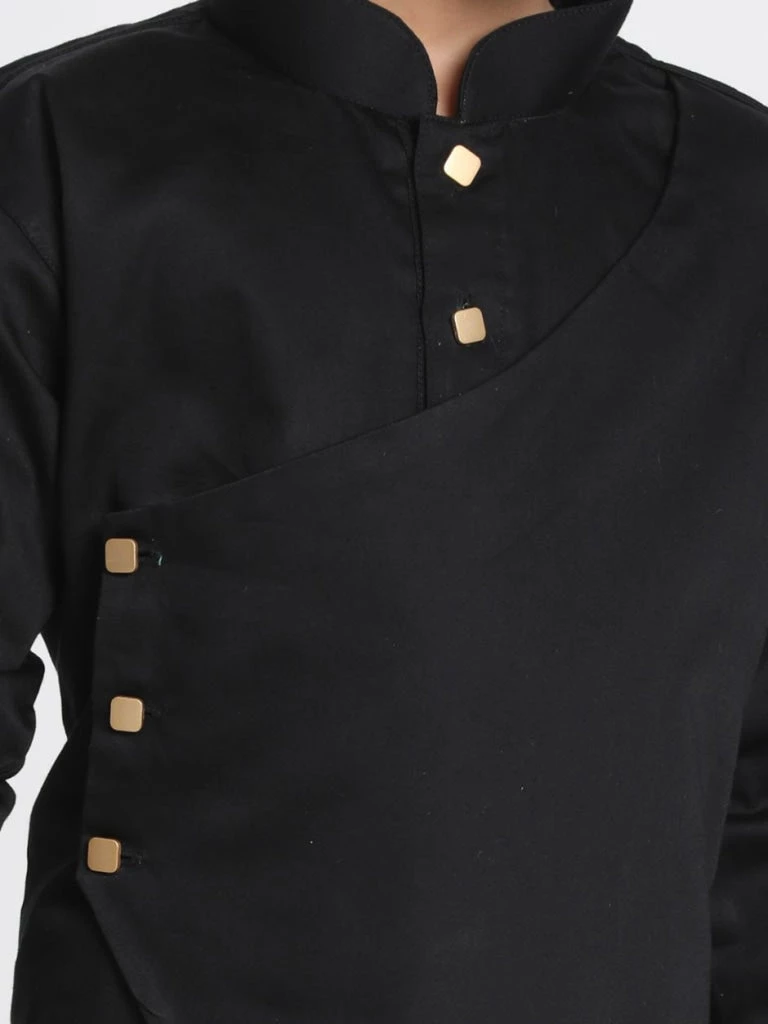A layered two part asymmetrical black solid straight calf length kurta, has a mandarin collar, button placket, long sleeves with cuff, side slits