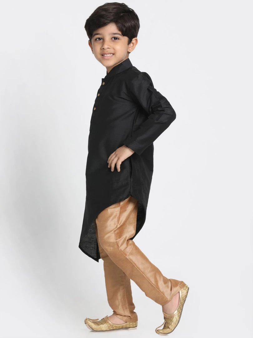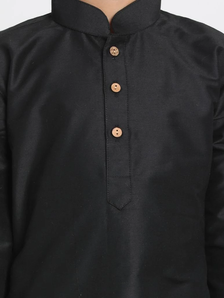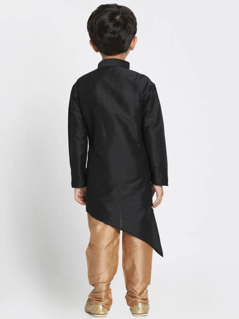 Black straight calf length kurta, has a mandarin collar, long sleeves, asymmetric hem, button placket, side slits