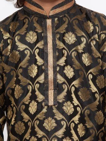 Black straight self-design woven knee length kurta, has a mandarin collar, long sleeves, straight hem, side slits