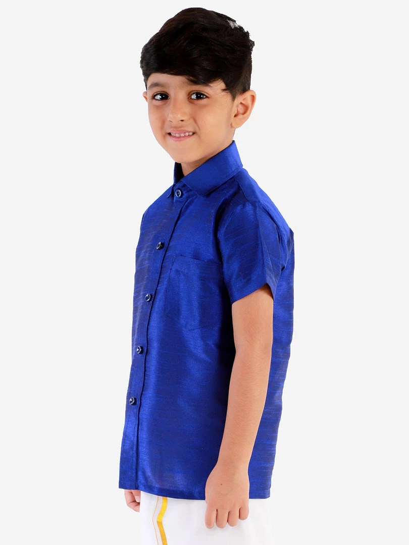 Blue solid casual shirt, has a shirt collar, short sleeves, full front button placket, curved hem, and one patch pocket