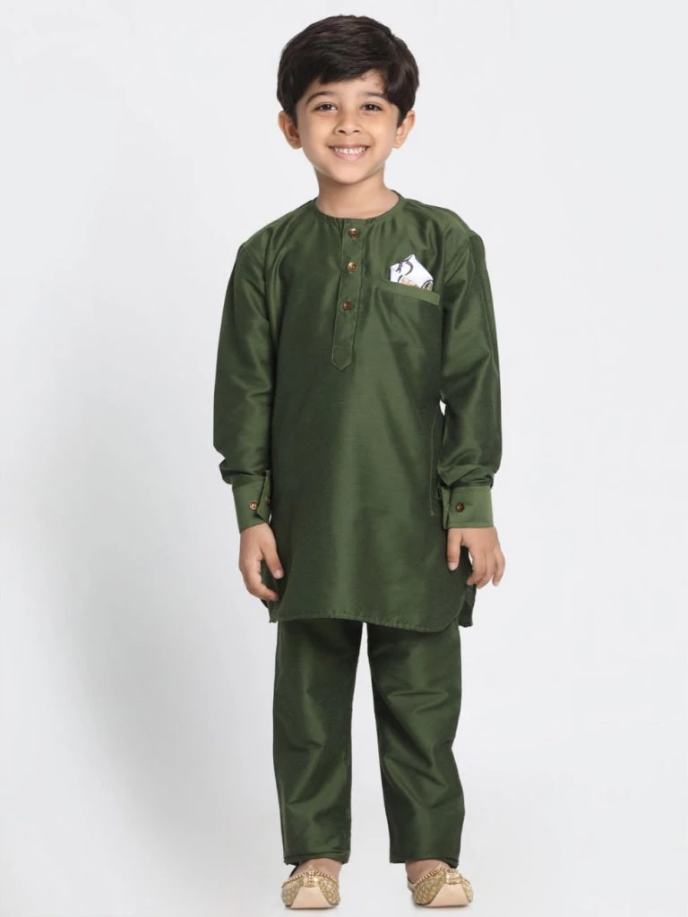 Green solid kurta, full sleeves, has a mandarin collar, knee-length, straight hemline, side-slits, and one pocket