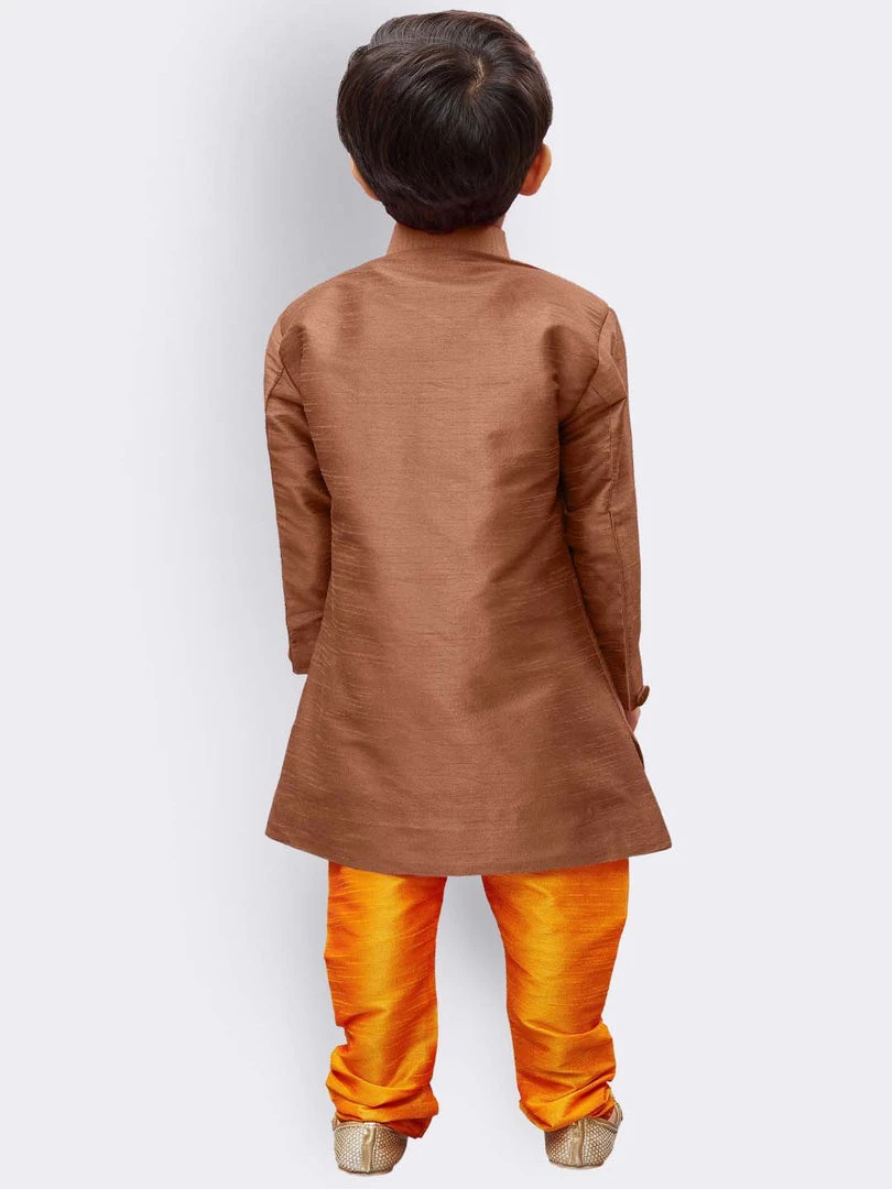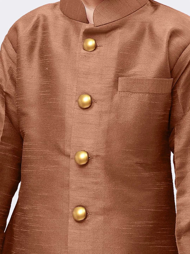 Brown straight solid knee length kurta, has a mandarin collar, long sleeves, full front button placket, straight hem, side slits and a welt pocket