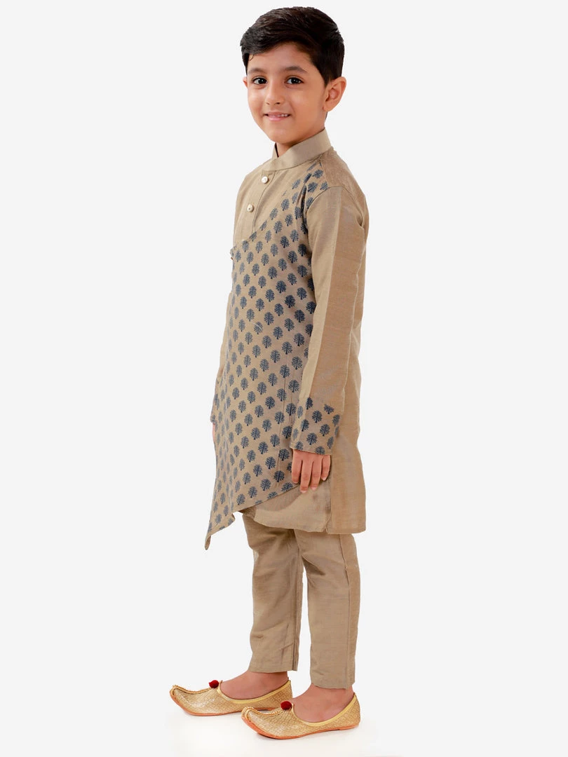 Chiku straight knee length kurta with a diagonal printed overlap design, has a mandarin collar, long sleeves, asymmetric hem, button placket, side slits