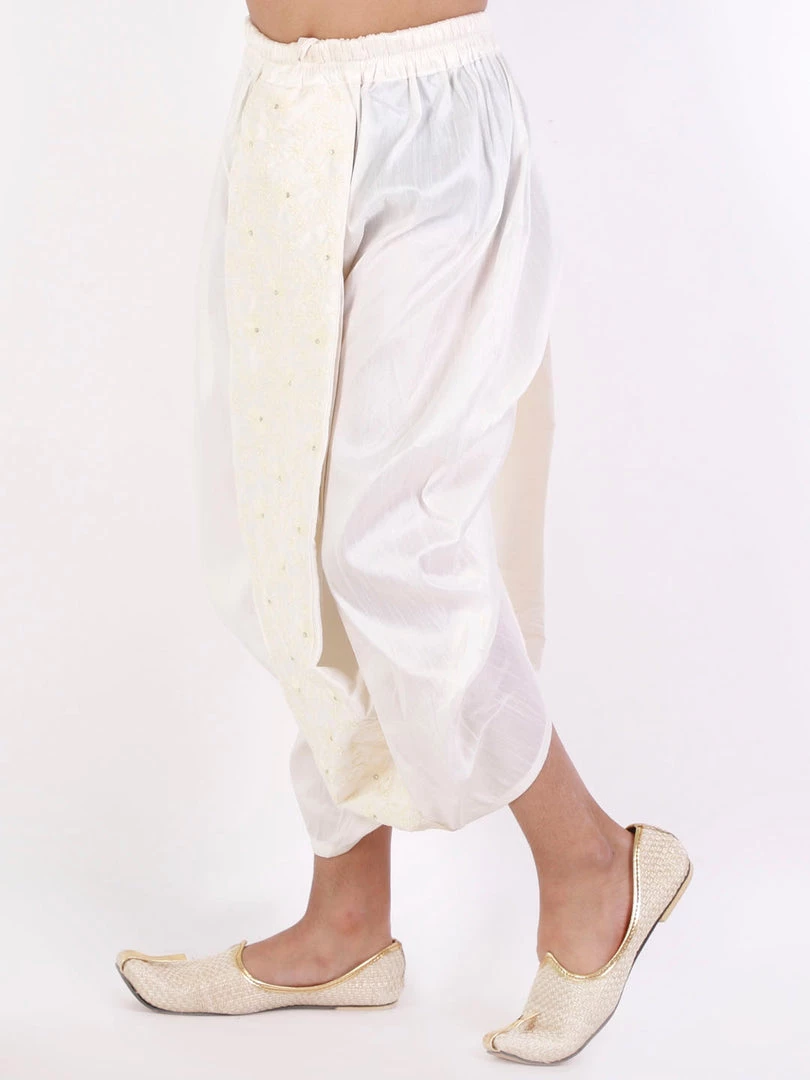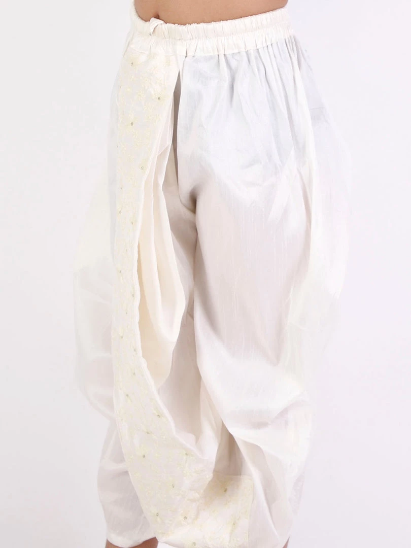 Cream solid ready-to-wear mid-rise silk-blend dhoti in a traditional pattern has embroidered front details and an elasticated waistband.