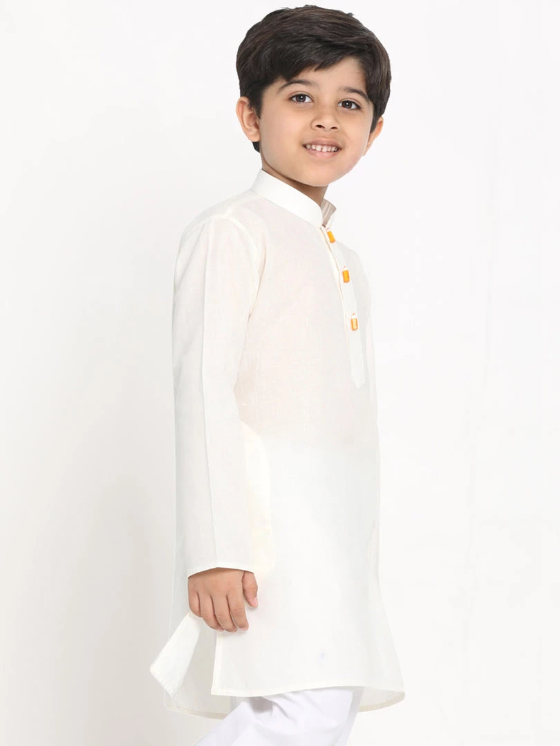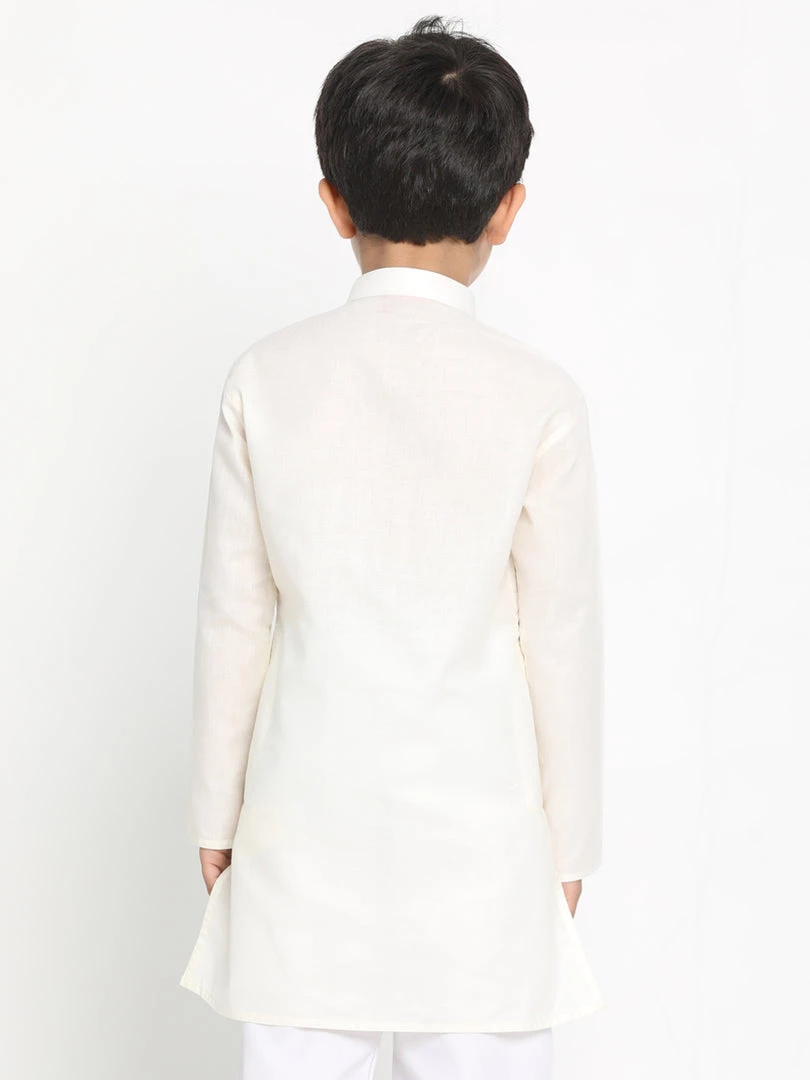 Cream solid straight knee length kurta, has mandarin collar, long sleeves, button placket with wooden pencil shape button, straight hem and side slits,