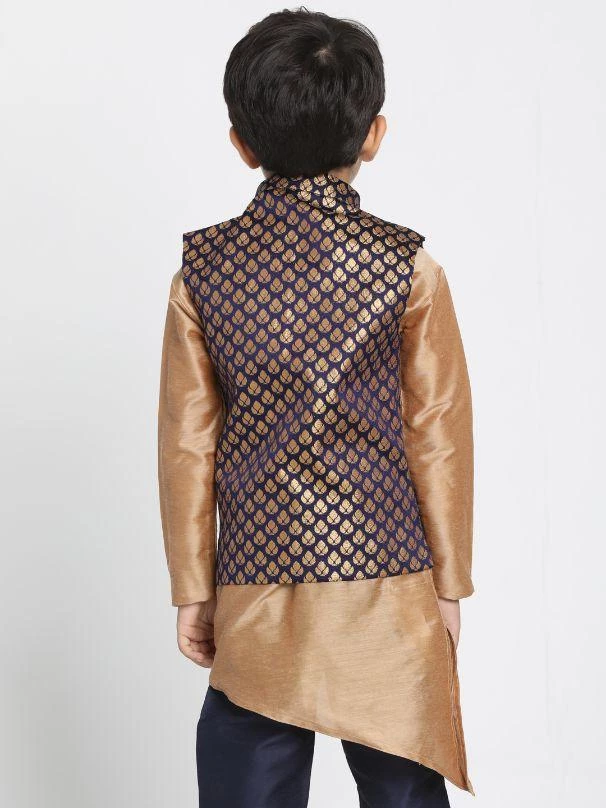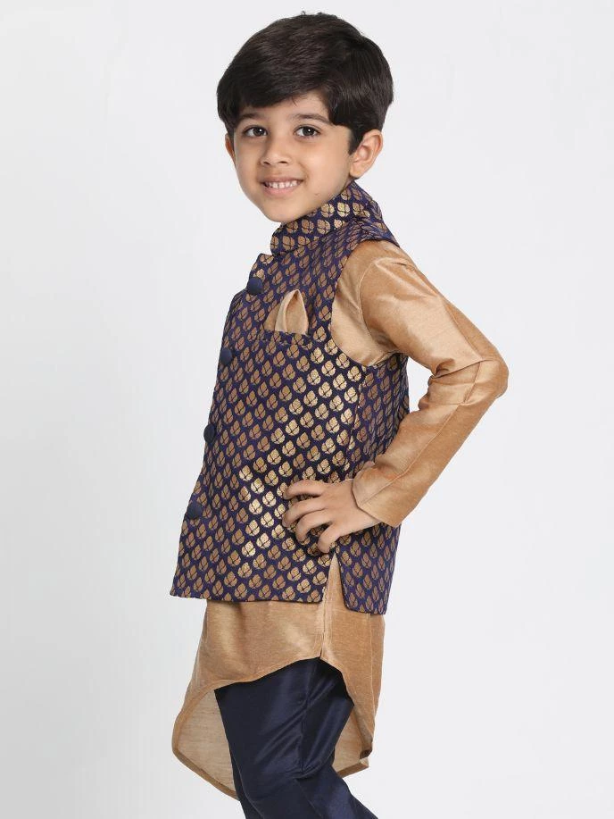 Deep blue and gold woven Nehru jacket, has a mandarin collar, a full button placket, sleeveless, straight hem, and one pocket with a pocket square.