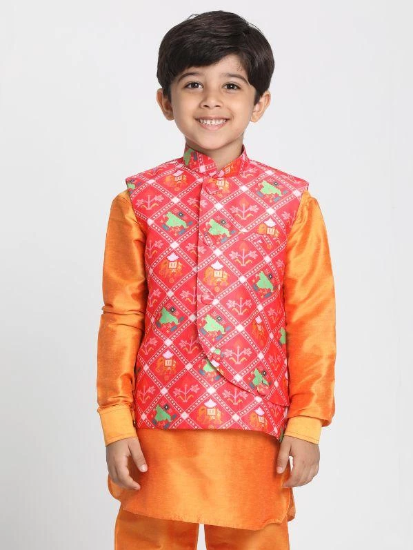 Coral coloured, green and white printed Nehru jacket, has a mandarin collar, sleeveless, straight hem, a full button placket, and three pockets.