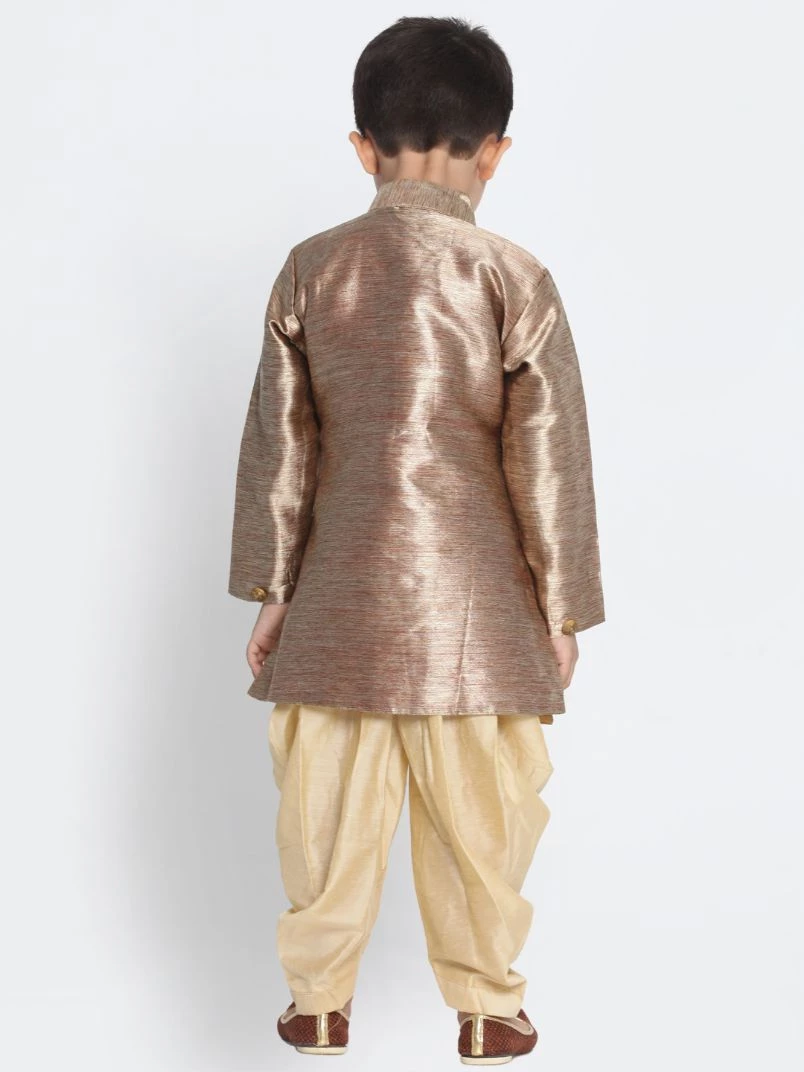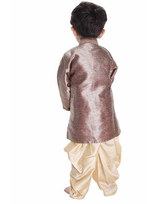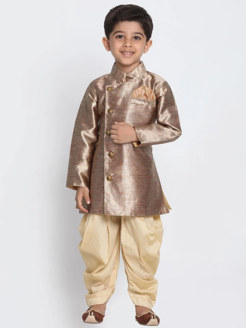 This sherwani set from Vastramay is a must have in your little boys ethnic collection wardrobe. Team is with a pair of mojaris for a cute ethnic look.