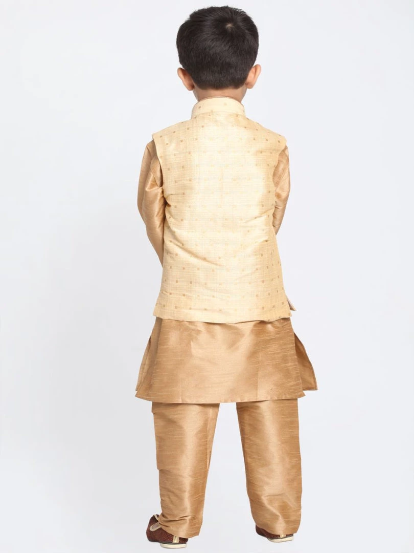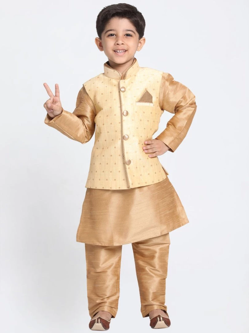 Golden and rose gold solid kurta with pyjama and Nehru jacket.