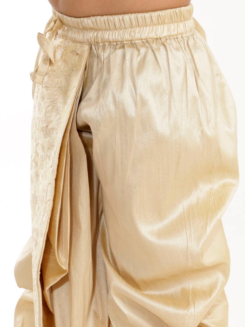 Gold ready to wear mid-rise dhoti with pleats and embroidered detailing, has elasticated waistband and drawstring closure
