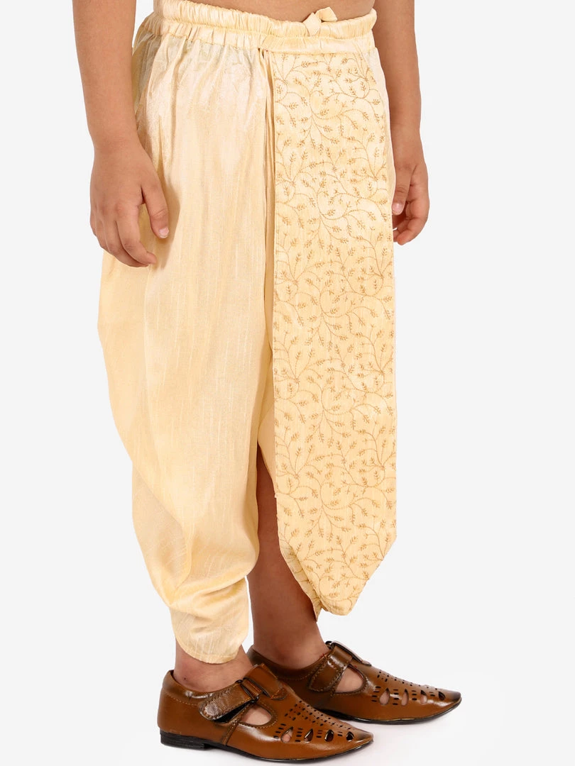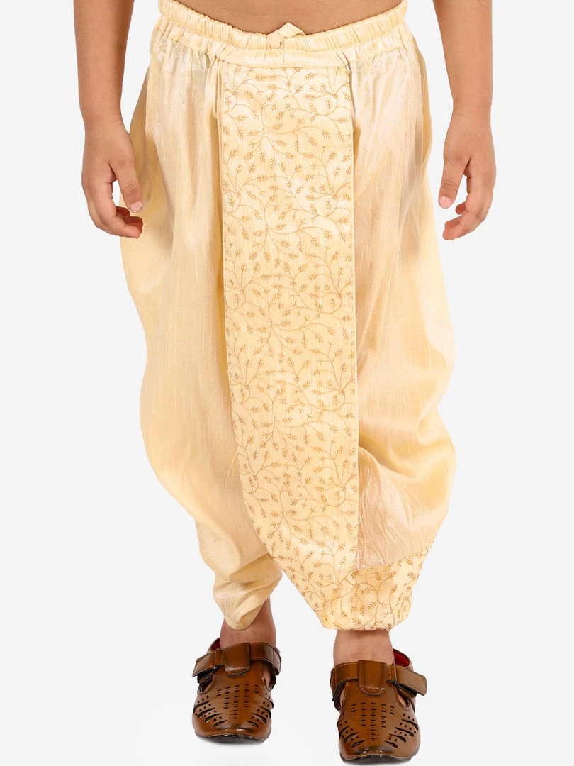 Gold solid ready to wear mid-rise dhoti with pleats and embroidered detailing, has elasticated waistband and drawstring closure