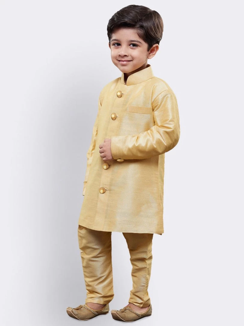 Golden solid kurta with pajama, Golden straight knee-length kurta, has a mandarin collar, long sleeves, straight hem, side slits, with one pocket.