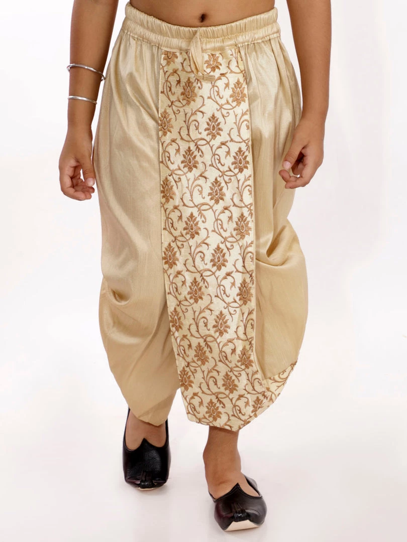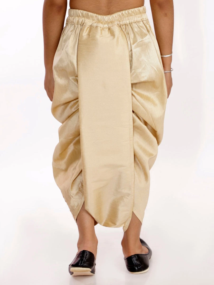 Golden solid ready to wear mid-rise dhoti with pleats and embroidered detailing on border, has elasticated waistband and drawstring closure