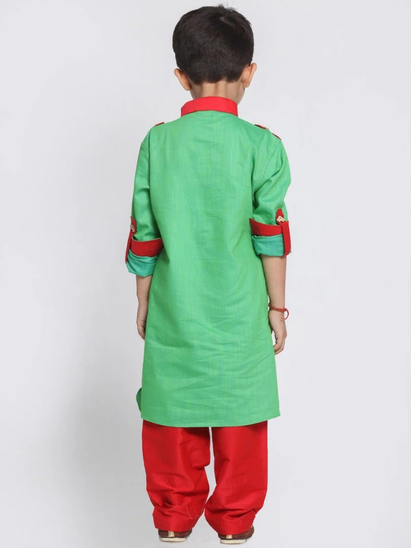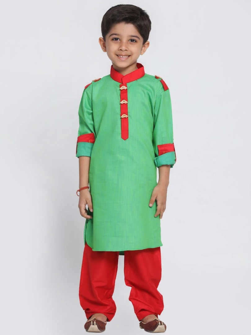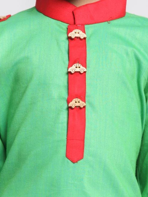 Green solid  kurta with salwar pants, Green straight knee-length kurta, has a mandarin collar, long sleeves, curved hem; side slits, pure cotton machine weave fabric, 2 pockets, Pathani style.Â
