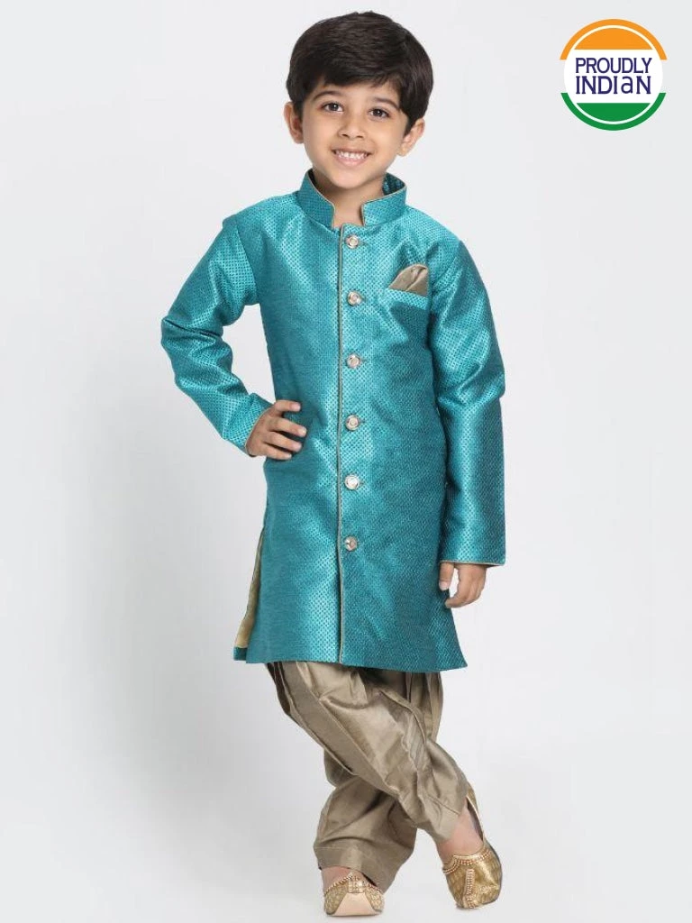 Surprise your little boy with this trending sherwani breeches set. This set will add more stars to your childs personality and will give him a complete ethnic look. You can team it up with matching footwear and accessories for a complete ethnic look.