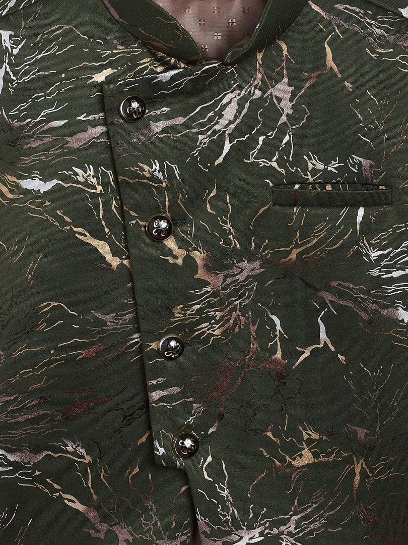 Green and brown foil printed woven regular-fit Nehru jacket, has a mandarin collar, asymmetric button placket, sleeveless, and one pocket