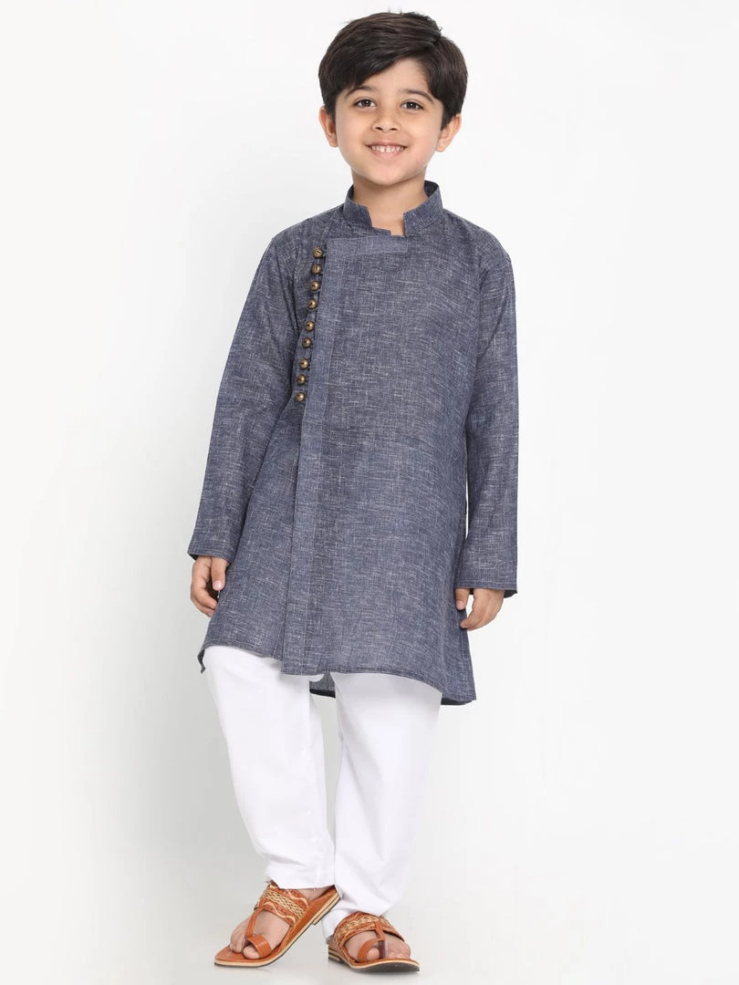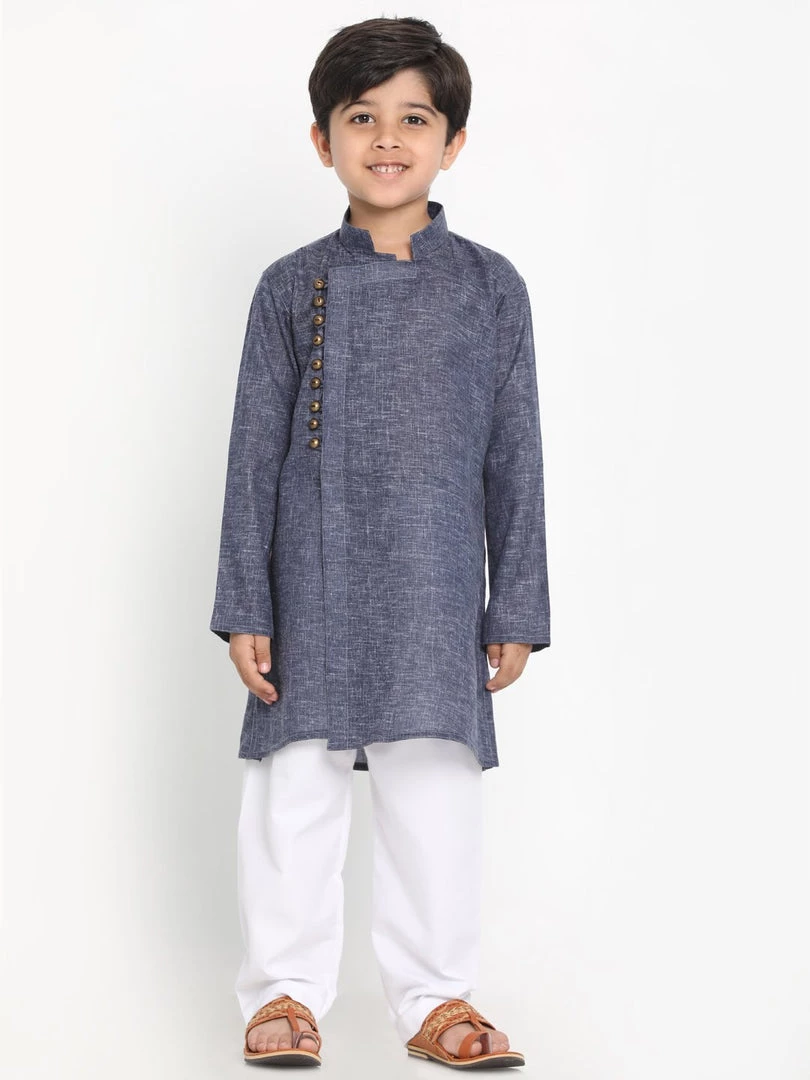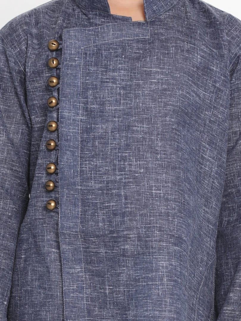 Grey straight knee length textured angrakha style kurta, has a mandarin collar, long sleeves, asymmetric hem, side button with loop, side slits