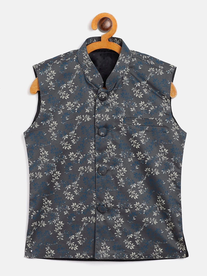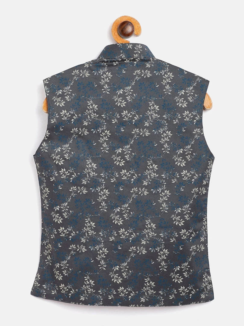 Grey and off white floral printed woven Nehru jacket, has a mandarin collar, a full button placket, sleeveless, one chest welt pocket, straight hemline