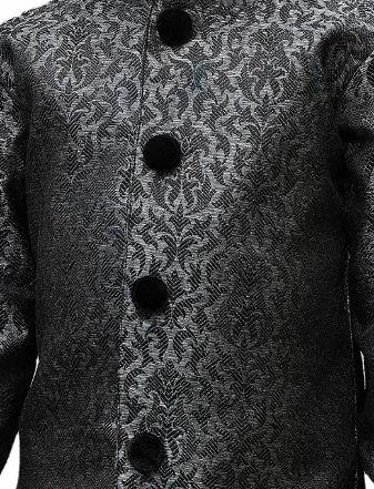 Black and grey knee length sherwani with woven design, has a mandarin collar, button placket, embroidery details on collar and sleeves, long sleeves.