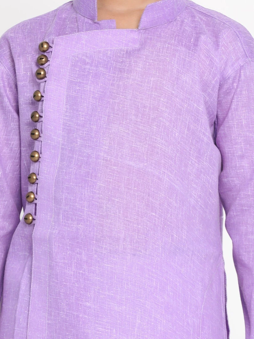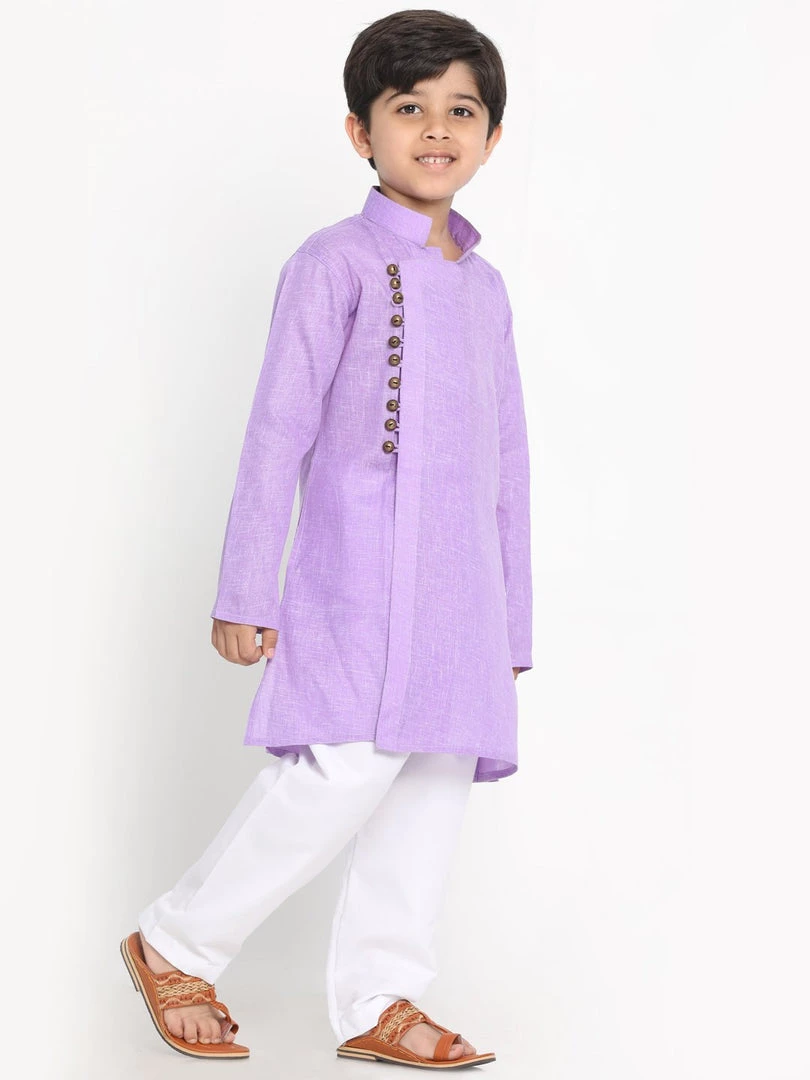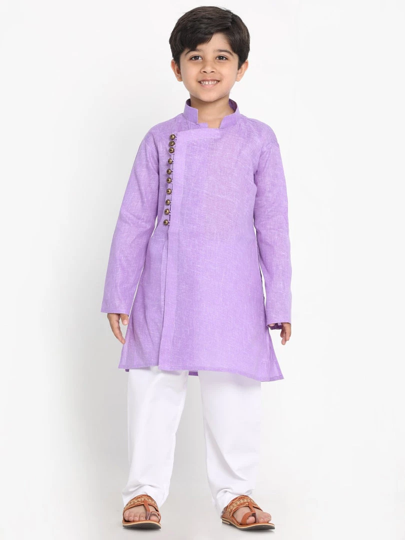 Lavender and white solid kurta with Pyjamas has a mandarin collar, Angrakha style, long sleeves, Straight shape, knee-length with a straight hem, Cotton blend machine weave fabric, 2 pockets.