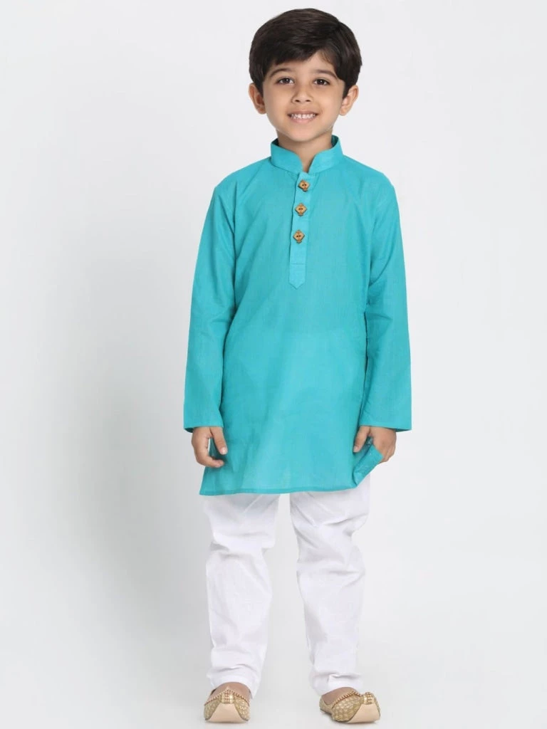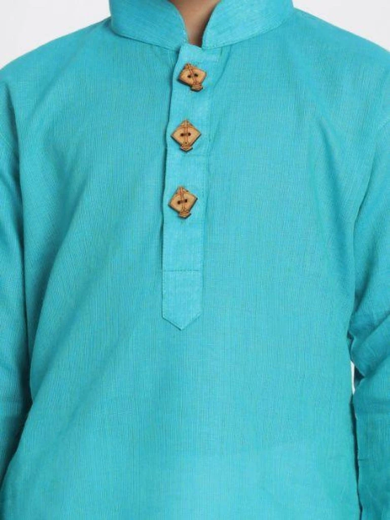 Cyan blue straight woven stripe knee length kurta, has a mandarin collar, long sleeves, straight hem, placket with kite shape wooden button, side slits