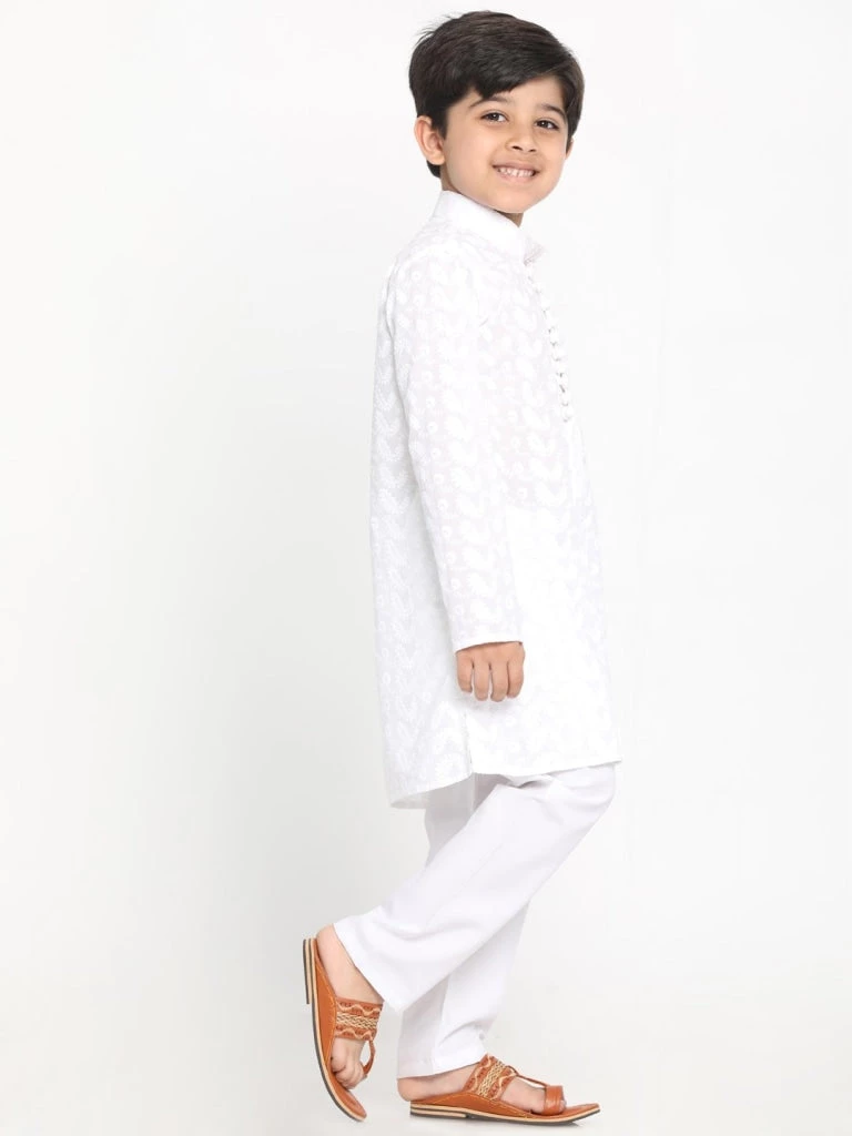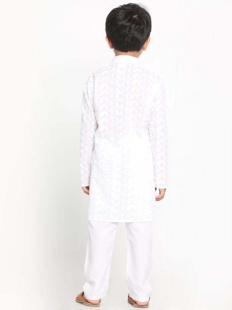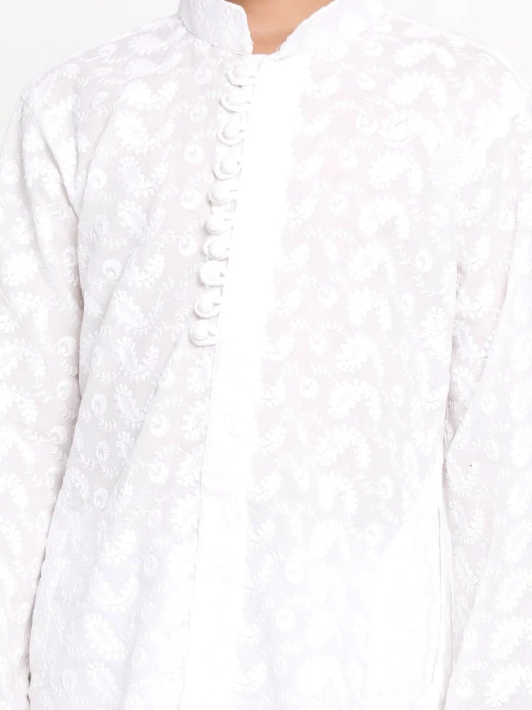 White straight knee length Chikankari kurta, has a mandarin collar, long sleeves, front button placket with loop, straight hem, side slites