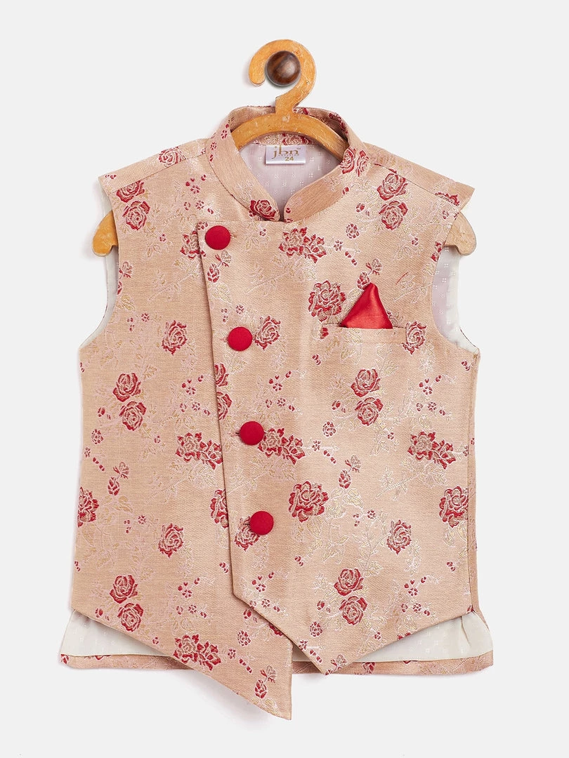Beige and maroon woven design regular-fit Nehru jacket, has a mandarin collar, a asymmetric button placket, sleeveless, asymmetric hem, and one pocket