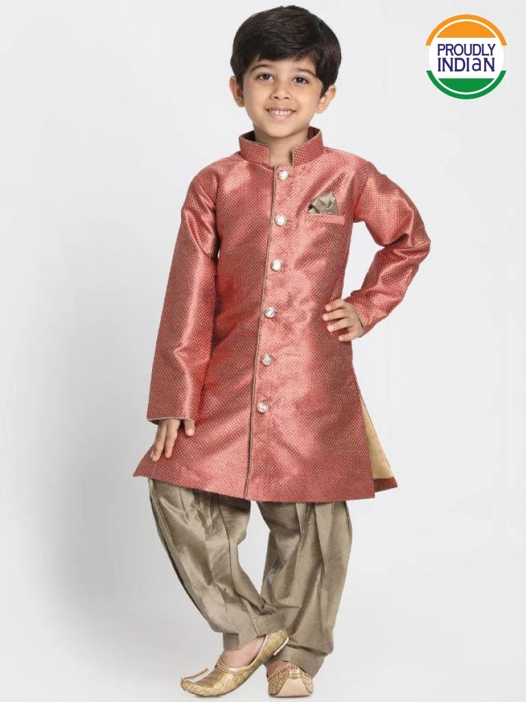 Surprise your little boy with this trending sherwani breeches set. This set will add more stars to your childs personality and will give him a complete ethnic look. You can team it up with matching footwear and accessories for a complete ethnic look.