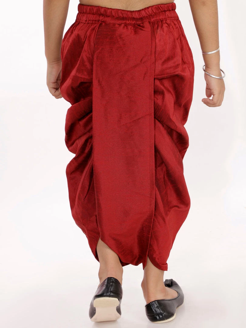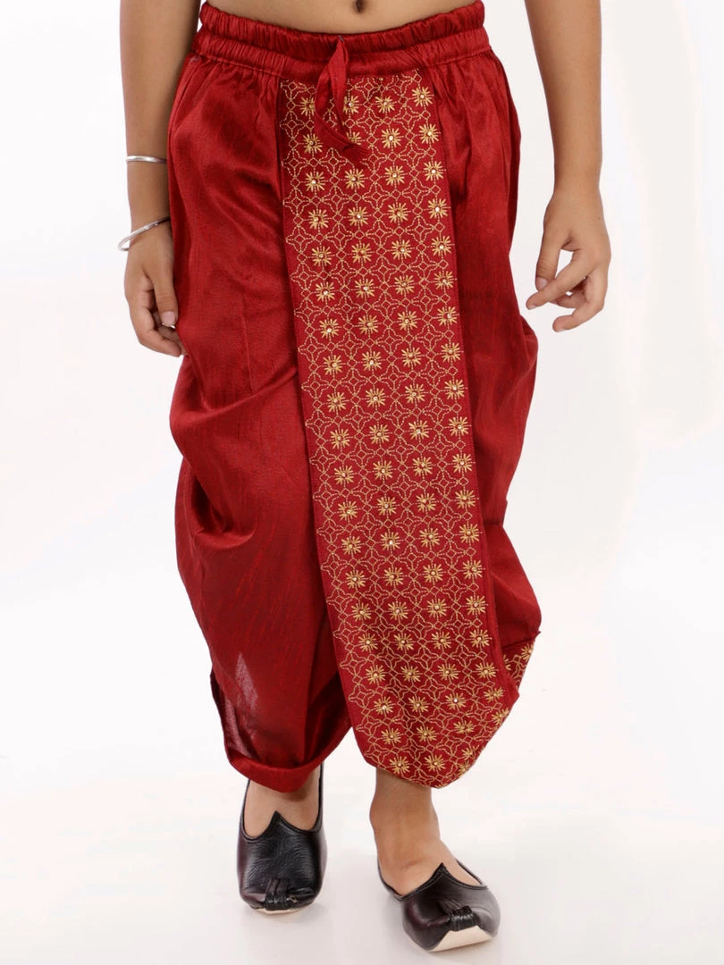Maroon solid ready to wear mid-rise dhoti with pleats and embroidered detailing, has elasticated waistband and drawstring closure
