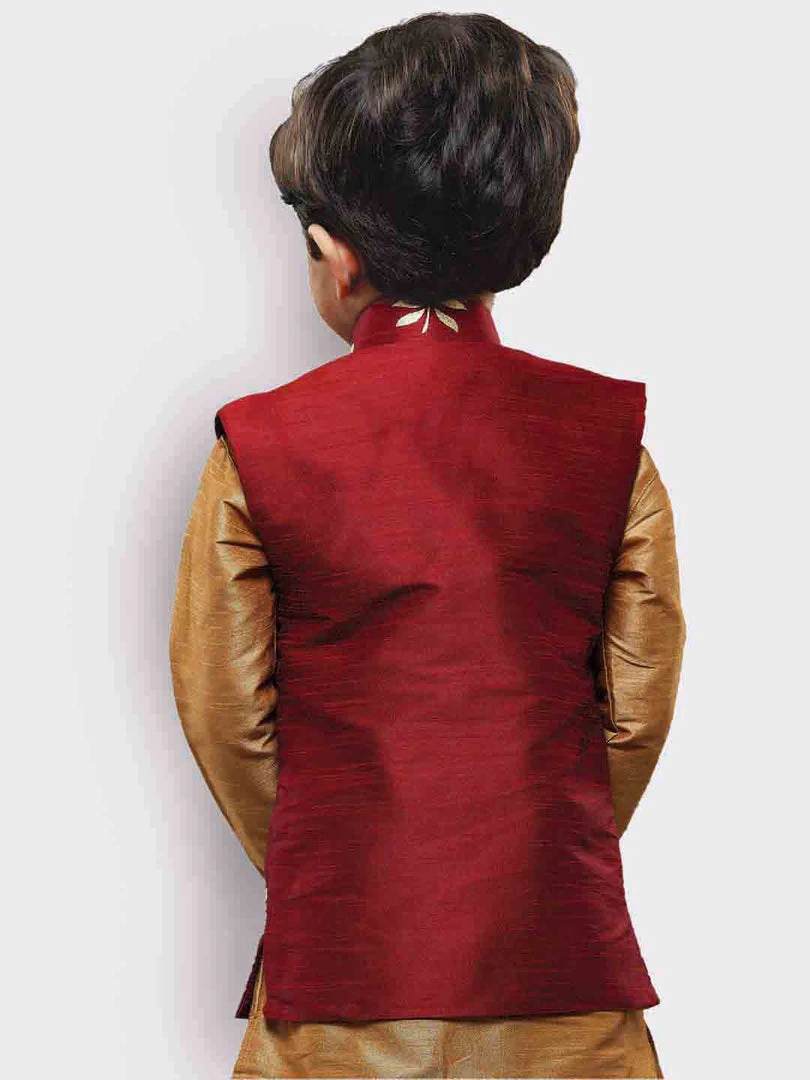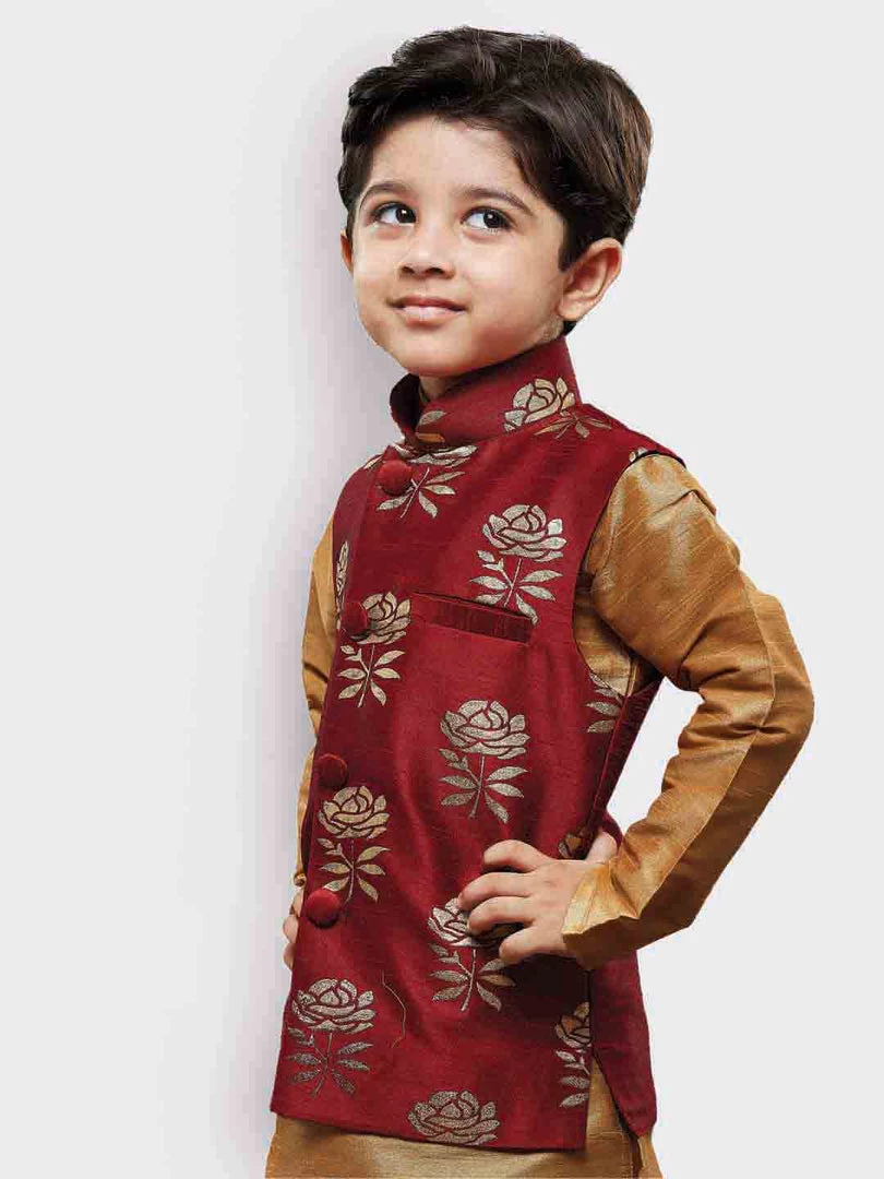 Maroon and gold digitally printed Nehru jacket, has a mandarin neck, a full button placket, sleeveless, straight hem, and one pocket.