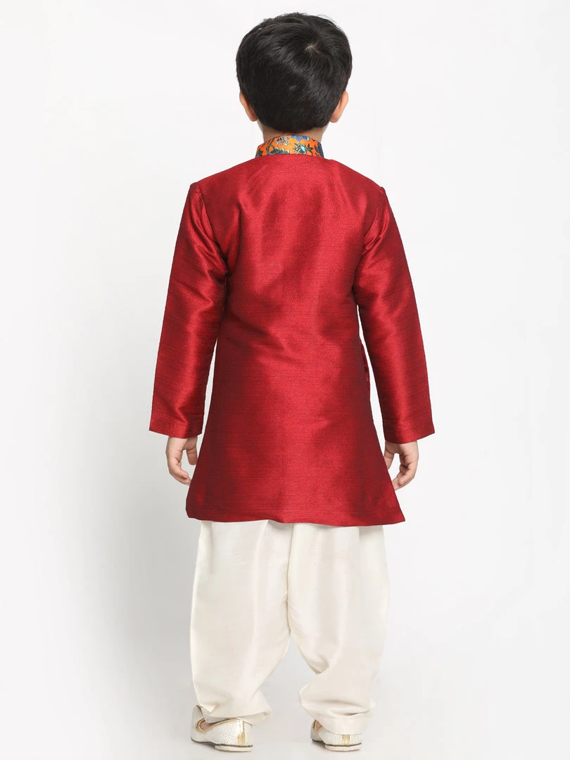 Multicolor-Base-Red floral printed knee length angrakha style sherwani has a mandarin collar, long sleeves, a full button side placket, side slits and straight hem.