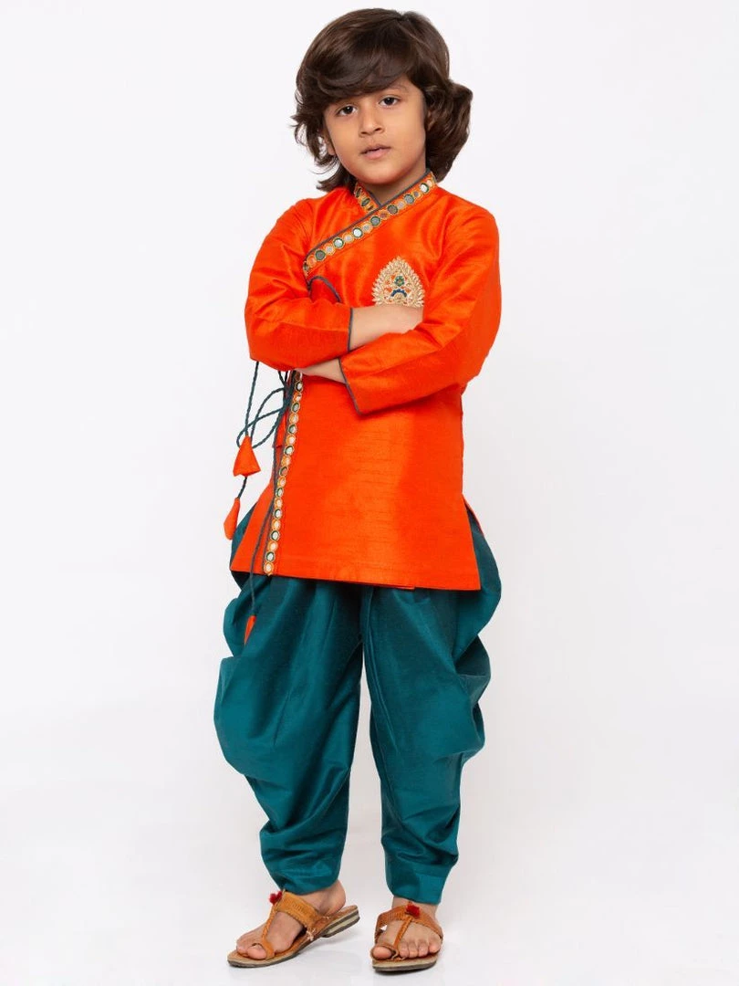Orange straight above knee length angrakha style kurta, has a v neck, long sleeves, has embellished details, straight hem, side slits