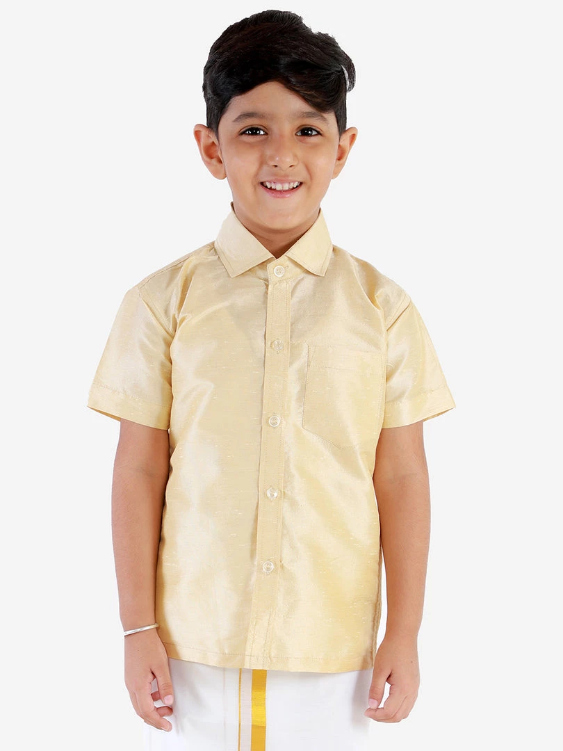 Gold toned ethnic casual shirt, has a shirt collar, short sleeves, full button placket, straight hem, and one patch pocket