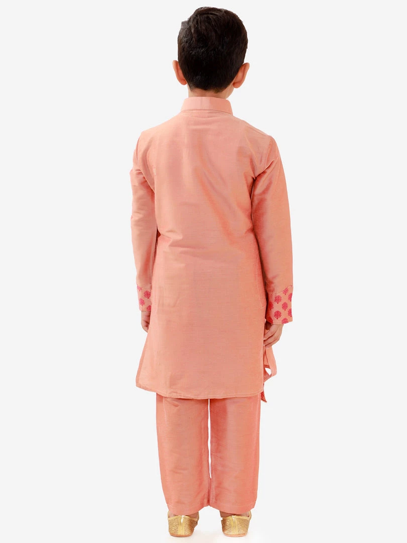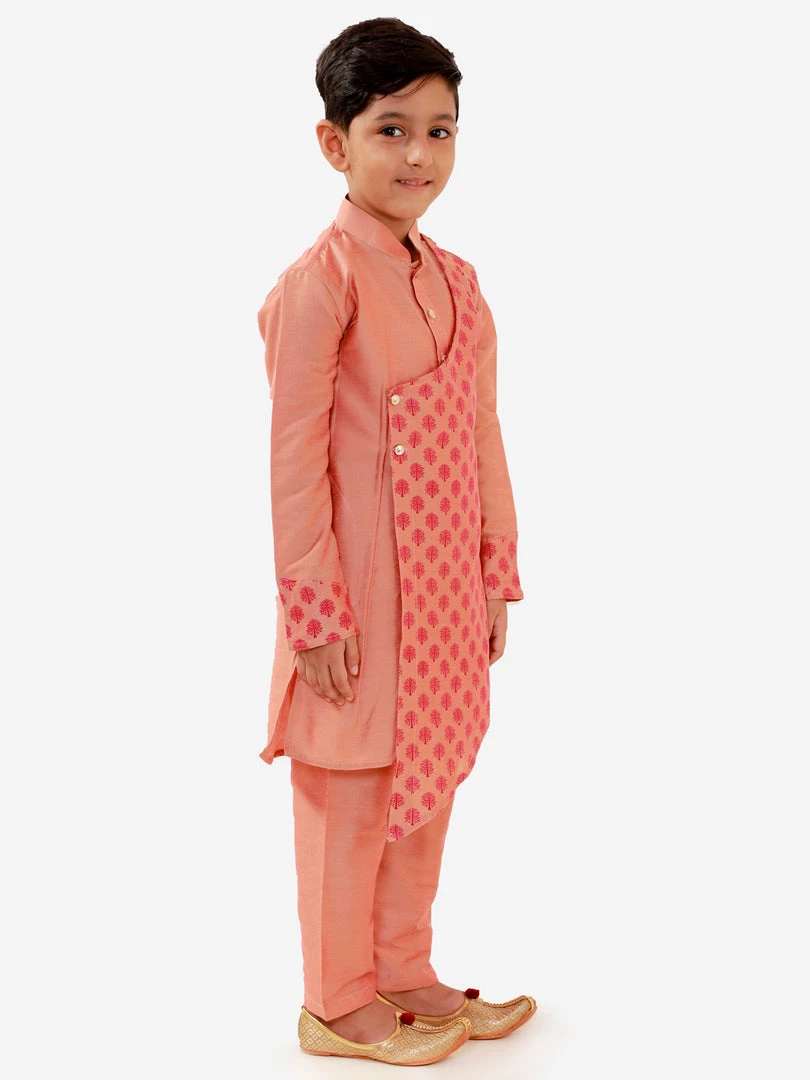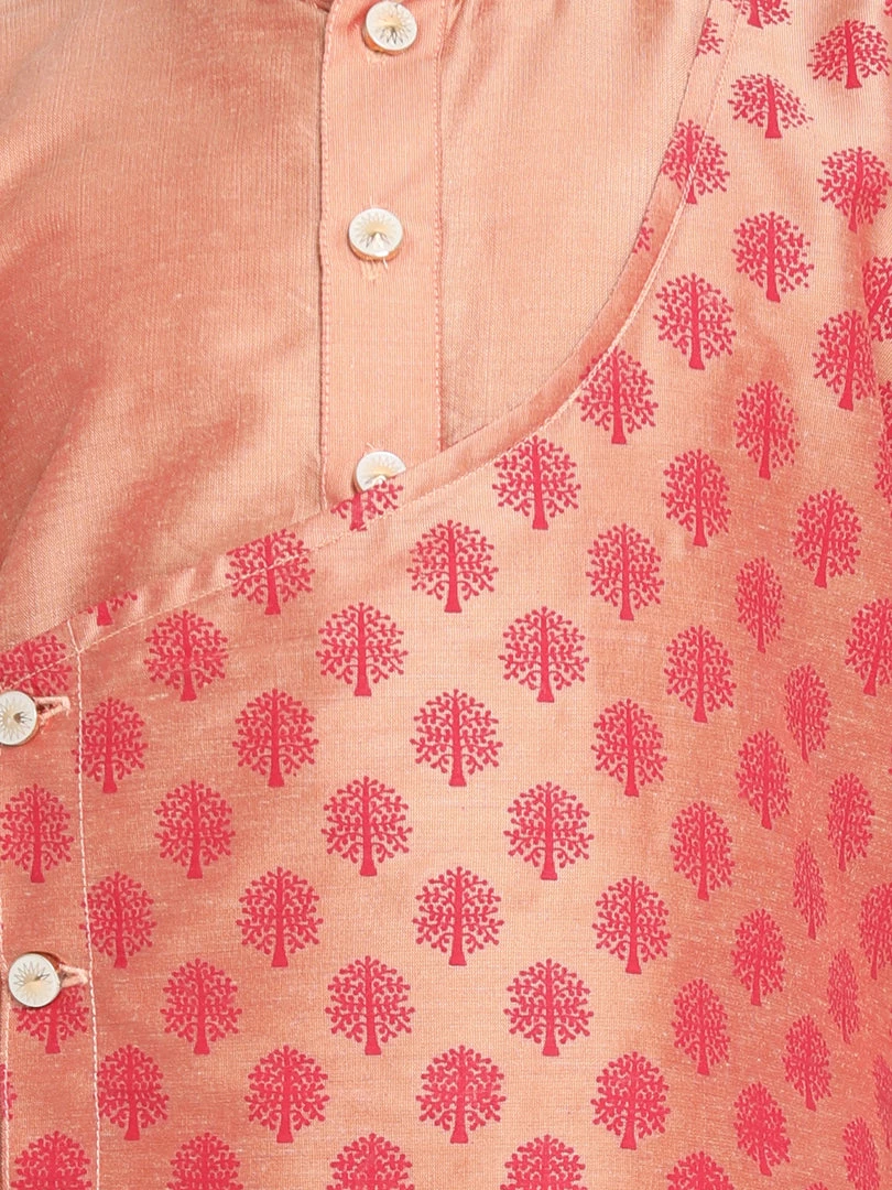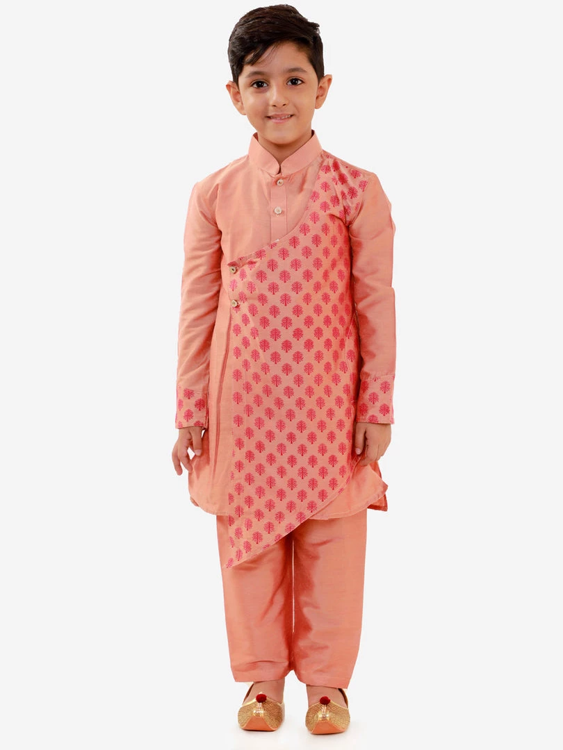 Pink straight knee length kurta with a diagonal printed overlap design and button as highlights, has a mandarin collar, long sleeves, asymmetrical hem, button placket, side slits