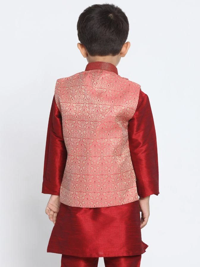 Pink and gold coloured and red woven design Nehru jacket has a mandarin collar, sleeveless, asymmetric hem, an asymmetric full button placket, one pocket.
