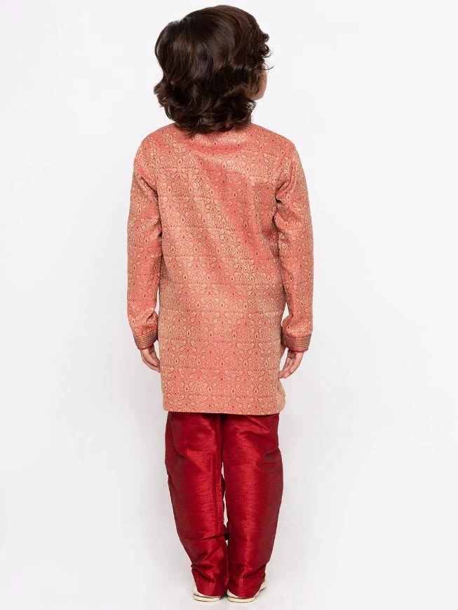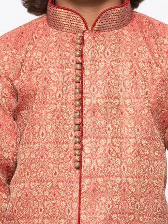 Pink woven-design above knee length sherwani, has a mandarin collar, button placket, long sleeves, embroidery details on collar and sleeves and side slits